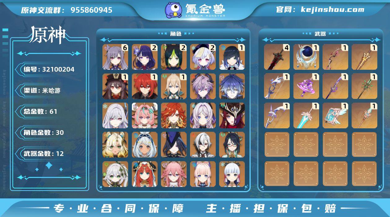 邮箱: 不送邮/死邮 总黄数: 61 冒险等级: 60 6命金色角色: 满命刻晴 2命金色角色: 二命七七,二命雷电将军,二命提纳里 1命金色角色: 一命迪卢克,一命琴,一命胡桃,一命夜兰 0命金色角色: 枫原万叶,神里绫华,钟离,莫娜,甘雨,珊瑚宫心海,八重神子,妮露,纳西妲,迪希雅,闲云,阿蕾奇诺,克洛琳德,玛拉妮,希诺宁,恰斯卡,玛薇卡,茜特菈莉,瓦雷莎,丝柯克,菲林斯,杜林 拥有武器: 狼的末路,天空之卷,和璞鸢,阿莫斯之弓,天空之傲,天空之脊,薙草之稻光,神乐之真意,若水,圣显之钥,最初的大魔术,纺夜天镜 4精武器: 狼的末路 1精武器: 天空之卷,和璞鸢,阿莫斯之弓,天空之傲,天空之脊,薙草之稻光,神乐之真意,若水,圣显之钥,最初的大魔术,纺夜天镜