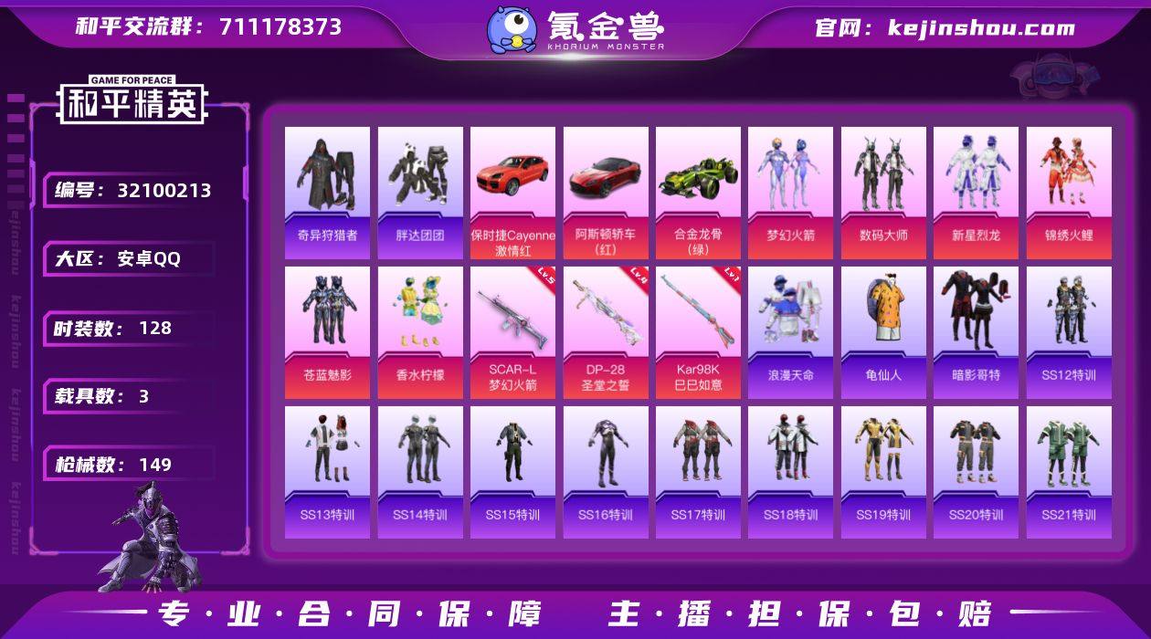 安卓 手Q-6粉装-6特效枪-3载具-2粉色飞行器-54022热力值-1王牌印记-128套装-149枪皮 【热门品类】:粉装-梦幻火箭,套装-浪漫天命,套装-奇异狩猎者,套装-胖达团团,套装-龟仙人,套装-暗影哥特 【粉色套装】:粉装-数码大师,粉装-梦幻火箭,粉装-新星烈龙,粉装-锦绣火鲤,粉装-苍蓝魅影,粉装-香水柠檬 【粉色枪皮等级】:SCAR-L-梦幻火箭(五级),UMP45-萌骑冒险(一级),AKS-74U-森灵之息(四级),Kar98K-巳巳如意(一级),Mk14-福马献瑞(三级),DP-28-圣堂之誓(四级) 【粉色载具】:阿斯顿马丁DBS(红),保时捷Cayenne(激情红),合金龙骨(绿) 【粉色枪皮】:SCAR-L-梦幻火箭,UMP45-萌骑冒险,AKS-74U-森灵之息,Kar98K-巳巳如意,Mk14-福马献瑞,DP-28-圣堂之誓 【粉色飞行器】:梦幻火箭飞行器,终极赛罗飞行器 【粉色降落伞】:快乐主宰降落伞,百万伏特降落伞,梦幻火箭降落伞,星之信仰降落伞,甜蜜誓约降落伞,心之恋语降落伞,锦绣火鲤降落伞,荧光虫舞降落伞,银刃赛罗降落伞,香水柠檬降落伞,炫彩糖果降落伞 【稀有套装】:套装-龟仙人,套装-马上有钱,套装-红釉青花 【稀有枪皮】:AKM-冰凉西瓜,AKM-夜灯,AKM-奇异狩猎者,AKM-彩虹符号,AKM-星之信仰,AKM-灼热熔岩,AKM-百万伏特,AKM-破晓战魂,AKM-锦绣火鲤,AKM-龙的传人,M16A4-幻世战舞者,M16A4-快乐主宰,M16A4-红色方程式,M16A4-蓝色火焰,SCAR-L-夏日绵绵冰,SCAR-L-炫彩节奏,SCAR-L-玉兔迎春,SCAR-L-甜蜜誓约,SCAR-L-红色方程式,M416-动感兔斯基,M416-快乐主宰,M416-滑板小狐,M416-红色方程式,M416-蓝色火焰,GROZA-治愈之星,AUG-天降萌叽,AUG-耀粉歌者,AUG-诡面斩,AUG-魔法学院,QBZ-原初圣火,QBZ-赛罗,M762-动感兔斯基,M762-天降萌叽,M762-奇异狩猎者,M762-快乐主宰,M762-牛气冲天,M762-镭射皇者,Mk47-...