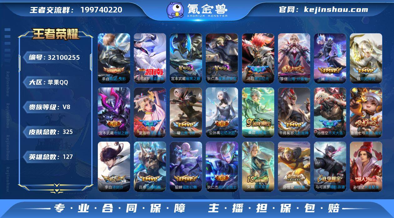 V8【李白典藏 怪盗基德 17传说 荣耀印记 市标墨子 市标澜 贵族积分65267】苹果QQ/永恒钻石/325皮肤/127英雄/1典藏/1珍品传说/17传说/89史诗/9稀有英雄 【2 星传说皮肤】幽冥之眼 宫本武藏,星际治安官 狄仁杰, 【1 珍品传说】怪盗基德 马可波罗, 【1 典藏皮肤】鸣剑·曳影 李白, 【17 传说皮肤】启明星使 虞姬,逐花归海 澜,云鹰飞将 曜,齐天大圣 孙悟空,诗剑行 李白,浮生妄 夏洛特,猫影幻舞 貂蝉,记忆之芯 公孙离,地狱之眼 宫本武藏,炽阳神光 镜,寅虎·瑞焰 鲁班七号,怒海麟威 吕布,久胜战神 干将莫邪,山海·炽霜斩 李信,超时空战士 狄仁杰,琥珀纪元 马超,鸣野蒿 桑启, 【89 史诗皮肤】末日机甲 吕布,紫霞仙子 露娜,百解令 蒙犽,高山流水 庄周,银河之约 李元芳,暗渊魔法 司马懿,暗影游猎 马可波罗,燃音魔法 高渐离,猫狗日记 大乔,德古拉伯爵 刘邦,山海·玄木吟 马可波罗,心灵战警 亚瑟,五谷丰年 鬼谷子,无心 元歌,鬼剑武藏 宫本武藏,迷踪丽影 阿轲,星夜王子 白起,线条小狗 周瑜,摇滚巨星 嬴政,电玩高手 狂铁,顽趣 梦奇,修罗 橘右京,拒霜思 嫦娥,魅力维加斯 妲己,黄金分割率 诸葛亮,偶像歌手 王昭君,赏金猎手 澜,星界游侠 暃,猪悟能 猪八戒,繁星吟游 蔡文姬,鹰眼统帅 狄仁杰,胡桃异想国 米莱狄,大圣娶亲 孙悟空,孙行者 孙悟空,李小龙 裴擒虎,纤云弄巧 云中君,龙骑士 墨子,降魔 墨子,金属风暴 墨子,傲雪梅枪 韩信,特工魅影 百里守约,猫狗日记 孙策,逐浪之夏 李元芳,未来纪元 赵云,时之彼端 妲己,魔术师 狄仁杰,皇家上将 赵云,冰冠公主 雅典娜,功夫厨神 程咬金,梁祝 上官婉儿,天才门将 刘禅,圣诞恋歌 貂蝉,水晶猎龙者 花木兰,破空之剑 亚连,魅语 不知火舞,天狼绘梦者 上官婉儿,白龙吟 韩信,地狱岩魂 廉颇,火炮绅士 黄忠,青蛇 小乔,月团寄思 沈梦溪,雪上飞焰 哪吒,千年之狐 李白,节奏热浪 阿轲,超时空战士 钟无艳,游园惊梦...