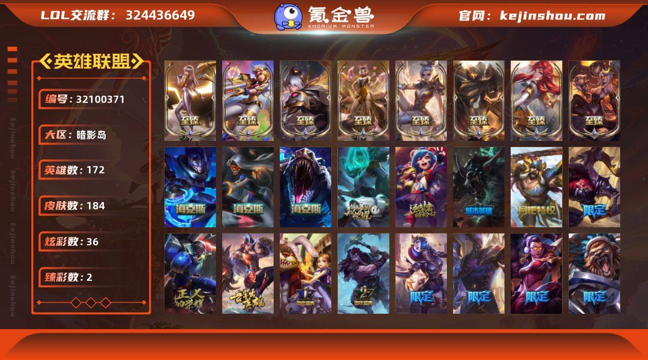 【LOLYH1593】172英雄/184皮肤/13神话/18限定/2臻彩/36炫彩/26传说/49史诗/黄金账号等级:612/10周年 安妮/源代码 乐芙兰/海克斯 嘉文四世/海克斯 雷克顿/海克斯 希维尔/至臻 电玩女神 凯特琳/至臻 K/DA 阿狸/至臻 K/DA 卡莎/至臻 烈焰美人 薇恩/至臻 王国机神玄武 盖伦/至臻 源计划:正义 艾瑞莉娅/至臻 玉剑传说 武剑仙/至臻 战斗学院 拉克丝/无畏骑士 瑟庄妮 赤子初心/幸福女神 乐芙兰/平安夜女神 娑娜/邪恶圣诞老人 维迦/魄罗骑士 瑟庄妮/冰雪女神 辛德拉/S3 SKT T1 薇恩/S4 SSW 雷恩加尔/S5 SKT T1 阿利斯塔/1周年 安妮/2周年 德莱厄斯/胜利女神 奥莉安娜/胜利之剑 亚托克斯/泳池派对 李青/暗影 沃里克/野兽猎人 泰达米尔/都铎王朝 图奇/玉剑传说 舞龙卫/防暴天使 凯尔/铁哥们儿 奥拉夫/地狱之门卫士 加里奥/魔幻卡牌 崔斯特/大天使长米迦勒 凯尔/战场女武神 凯尔/源计划:林 易/霸天零式 赛恩/女皇 艾希/鬼魂新娘 莫甘娜/陆地王者4WD 布里茨/丧尸 布兰德/第三类接触 黑默丁格/屠龙勇士 潘森/黯黑魔龙 希瓦娜/焰尾妖狐 阿狸/偶像歌手 阿狸/光明哨兵 格雷福斯/至高天 韦鲁斯/宇航员 诺提勒斯/女校长 菲奥娜/金牌主播 德莱文/霸天异形 卡兹克/灌篮高手 德莱厄斯/黑夜使者 亚索/星之守护者 金克丝/天煞 劫/安伯斯与提妮/钢铁之心 希维尔/法国皇室 厄运小姐/黑帮狂花 厄运小姐/刀锋女王 莫甘娜/炼金狂士 辛吉德/死神 卡尔萨斯/侏罗纪化石 科加斯/飞越疯人院 萨科/武动巅峰 萨科/战争血统 蒙多/夜行义贼 艾瑞莉娅/特种部队 普朗克/穿着正装的恶魔 维迦/北领前线 斯维因/黑曜石守护者 墨菲特/前线指挥官 卡特琳娜/沙漠风暴 卡特琳娜/蓝焰梦魔 魔腾/符文战神 雷克顿/腥红之月 伊莉丝/V字仇杀者 布兰德/防弹武僧 李青/地下拳王 李青/军神战甲 波比/飞车暴走族 古拉加斯/死亡领主 莫德凯撒/腥红之月 泰隆/侏罗纪化石 克...