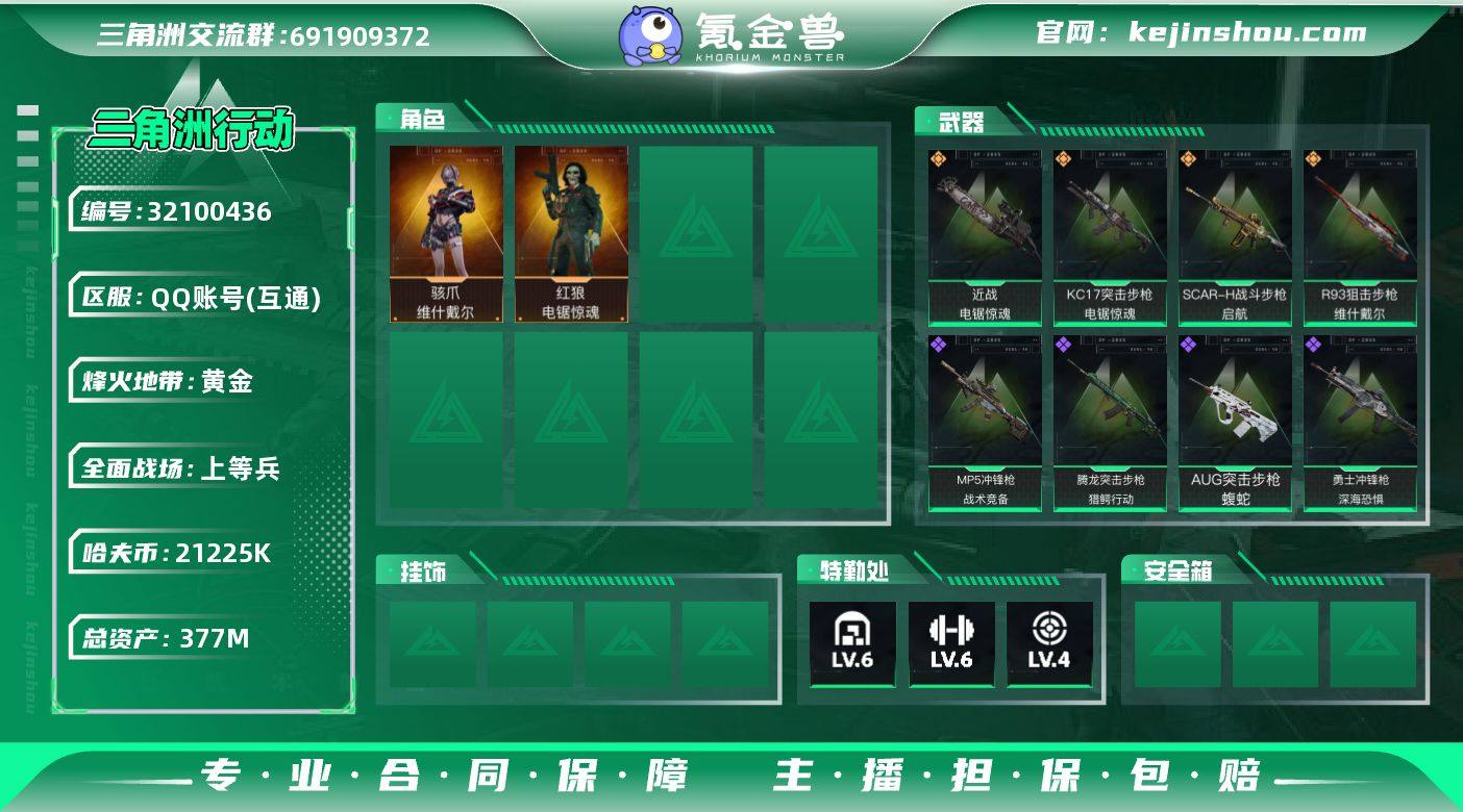 总资产377m【店主推荐捡漏号!可直接换绑】21225k哈伏币-377m流动资产-60烽火等级-黄金-14战场等级-上等兵 【干员外观】:骇爪-维什戴尔,红狼-电锯惊魂 【近战皮肤】:近战-电锯惊魂,近战-黑鹰 【传说级普通外观】:SCAR-H战斗步枪-启航,KC17突击步枪-电锯惊魂,R93狙击步枪-维什戴尔 【史诗级普通外观】:AUG突击步枪-蝮蛇,腾龙突击步枪-猎鳄行动,MP5冲锋枪-战术竞备,勇士冲锋枪-深海恐惧 【稀有级普通外观】:AUG突击步枪-前沿科技,SCAR-H战斗步枪-荣耀列队,MP5冲锋枪-弄臣,Vector冲锋枪-先锋,SMG-45-行动开启,M1014霰弹枪-幻影结构,Mini-14射手步枪-荣耀列队,SV-98狙击步枪-星链科技,G18-星链科技 【普通级普通外观】:M4A1突击步枪-高雅黑,M4A1突击步枪-海色,QBZ95-1突击步枪-高雅黑,QBZ95-1突击步枪-海浪,QBZ95-1突击步枪-三角洲力量,QBZ95-1突击步枪-海色,K416突击步枪-几何迷彩,M7战斗步枪-红色涂装,SG552突击步枪-三角洲力量,SG552突击步枪-浅蓝涂装,SCAR-H战斗步枪-数码迷彩,G3战斗步枪-高雅黑,PTR-32突击步枪-黄蜂,MP5冲锋枪-海色,MP5冲锋枪-黄蜂,UZI冲锋枪-海色,QCQ171冲锋枪-三角洲力量,M1014霰弹枪-高雅黑,M1014霰弹枪-海浪,M249轻机枪-黄蜂,SR-25射手步枪-黄蜂,SV-98狙击步枪-红色涂装,沙漠之鹰-海浪 【军牌】:军牌-装备修理,军牌-永恒,军牌-零号大坝,军牌-来点薯条,军牌-幸福国,军牌-信誉优秀 【挂饰】:挂饰-维什戴尔,挂饰-诡影狙击兵,挂饰-诡影喷火兵,挂饰-启程,挂饰-阿萨拉徽章