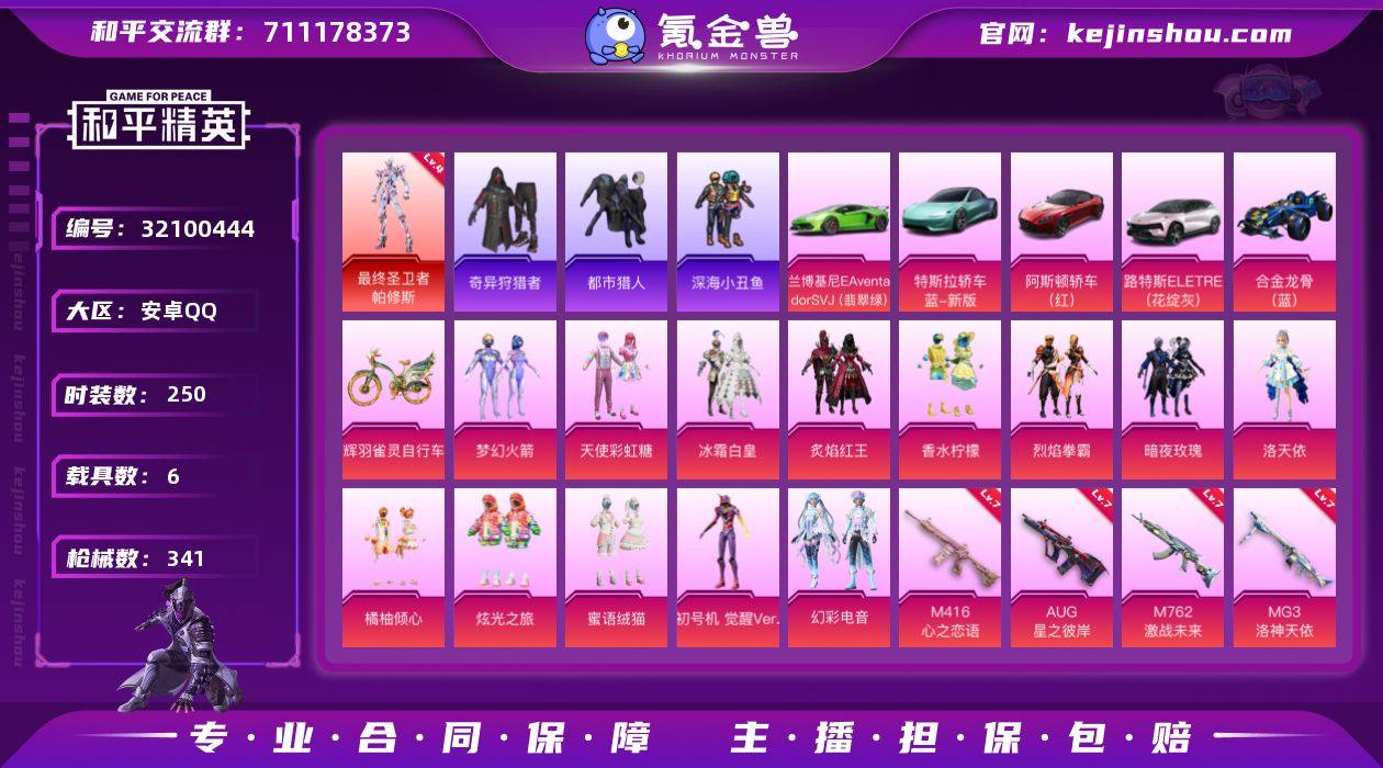 安卓 手Q-1神装-14粉装-14特效枪-6载具-9粉色飞行器-125906热力值-22王牌印记-250套装-341枪皮 【红色神装等级】:最终圣卫者-帕修斯(四级) 【红色角色神装】:最终圣卫者-帕修斯 【热门品类】:粉装-梦幻火箭,套装-浪漫天命,套装-都市猎人,套装-深海小丑鱼,套装-奇异狩猎者,套装-星河浪客,套装-龟仙人,套装-潮萌小黄鸭,套装-粉红小猪,角色-8号机,角色-Mark.06 【粉色套装】:粉装-天使彩虹糖,粉装-梦幻火箭,粉装-冰霜白皇,粉装-炙焰红王,粉装-香水柠檬,粉装-烈焰拳霸,粉装-暗夜玫瑰,角色-洛天依,粉装-橘柚倾心,粉装-炫光之旅,粉装-蜜语绒猫,角色-初号机 觉醒Ver.,粉装-幻彩电音,角色-虹云熊熊 【粉色枪皮等级】:SCAR-L-锦绣绵绵(五级),M416-心之恋语(七级),AUG-星之彼岸(七级),M762-激战未来(七级),UMP45-量子极限(五级),Vector-最终圣卫者(三级),Kar98K-巳巳如意(五级),Mk14-福马献瑞(五级),AA12-G-萌骑幻想(一级),DP-28-豹影疾电(五级),MG3-洛神天依(七级),MG3-辉羽雀灵(三级),信号枪-金乌曜日(三级),烟雾弹-电雾迷城(五级) 【粉色载具】:特斯拉Roadster(水滴蓝),兰博基尼Aventador SVJ(翡翠绿),阿斯顿马丁DBS(红),路特斯ELETRE(花绽灰),合金龙骨(蓝),辉羽雀灵自行车 【粉色枪皮】:SCAR-L-锦绣绵绵,M416-心之恋语,AUG-星之彼岸,M762-激战未来,UMP45-量子极限,Vector-最终圣卫者,Kar98K-巳巳如意,Mk14-福马献瑞,AA12-G-萌骑幻想,DP-28-豹影疾电,MG3-洛神天依,MG3-辉羽雀灵,信号枪-金乌曜日,烟雾弹-电雾迷城 【粉色飞行器】:炫彩糖果飞行器,激战未来飞行器,龙翔九天飞行器,深渊漩涡飞行器,圣域金龙飞行器,雀灵庇佑飞行器,终晖之翼飞行器,灵猫魔法师飞行器 【粉色降落伞】:甜心宝贝降落伞,至尊龙雀降落伞,梦幻火箭降落伞,甜蜜誓...