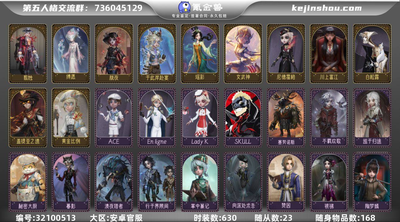 阅历等级:59 时装数:630 虚妄杰作时装数:0 稀世时装数:11 奇珍时装数:102 随从数:23 稀世随从数:0 奇珍随从数:7 随身物品数:168 虚妄杰作随身物品数:0 稀世随身物品数:13 奇珍随身物品数:58 角色数:69 杰克-翦烛,昆虫学者-缚愿,红蝶-胧夜,幻灯师-于此岸赴宴,渔女-瑶彩,舞女-女武神,空军-尼德霍格,梦之女巫-川上富江,“使徒”-白松露,勘探员-盖提亚之遗,画家-黄金比例,杂技演员-ACE,摄影师-En ligne,调香师-Lady K,前锋-SKULL 卖家说:画家黄比,使徒白松露,爱哭鬼恸哭,园丁真相小姐加牛仔,幻灯一限,空军毛利兰以及绝版挂件,号上还有很多绝版皮肤加一张紫皮卡