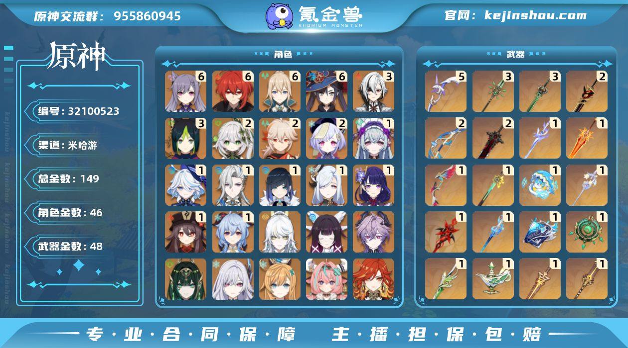 冒险等级:60 总黄数:149 5星角色数:46 5星武器数:48 原石数量:1107 相遇之缘数量:1 纠缠之源数量:0 6命刻晴,6命迪卢克,6命琴,6命莫娜,3命阿蕾奇诺,3命提纳里,2命纳西妲,2命枫原万叶,2命七七,1命梦见月瑞希,1命芙宁娜,1命那维莱特,1命夜兰,1命申鹤,1命雷电将军,1命胡桃,1命甘雨,0命兹白,0命哥伦比娅,0命杜林,0命奈芙尔,0命丝柯克,0命爱可菲,0命瓦雷莎,0命玛薇卡,0命茜特菈莉,0命恰斯卡,0命希诺宁,0命玛拉妮,0命希格雯,0命克洛琳德,0命莱欧斯利,0命艾尔海森,0命妮露,0命赛诺,0命神里绫人,0命八重神子,0命魈,0命荒泷一斗,0命宵宫,0命神里绫华,0命钟离,0命达达利亚,0命可莉,0命温迪,0命迪希雅 6命班尼特,6命菲米尼,6命嘉明,6命久岐忍,6命卡齐娜,6命蓝砚,6命欧洛伦,6命绮良良,6命赛索斯,6命香菱,6命行秋,6命夏沃蕾,6命芭芭拉,6命北斗,6命重云,6命迪奥娜,6命珐露珊,6命菲谢尔,6命九条裟罗,6命柯莱,6命雷泽,6命罗莎莉亚,6命鹿野院平藏,6命诺艾尔,6命凝光,6命砂糖,6命托马,6命五郎,6命辛焱,6命烟绯,6命瑶瑶,6命云堇,6命早柚,5命琳妮特,5命夏洛蒂,5命伊安珊,5命伊法,5命安柏,5命多莉,5命卡维,5命坎蒂丝,3命凯亚,3命丽莎,3命莱依拉,2命爱诺,2命米卡,0命雅珂达,0命塔利雅,0命埃洛伊 精5阿莫斯之弓,精3和璞鸢,精3磐岩结绿,精2赤角石溃杵,精2终末嗟叹之诗,精2狼的末路,精1苍耀,精1焚曜千阳,精1星鹫赤羽,精1岩峰巡歌,精1冲浪时光,精1柔灯挽歌,精1赤月之形,精1静水流涌之辉,精1万世流涌大典,精1碧落之珑,精1裁叶萃光,精1千夜浮梦,精1圣显之钥,精1赤沙之杖,精1若水,精1波乱月白经津,精1神乐之真意,精1薙草之稻光,精1飞雷之弦振,精1雾切之回光,精1苍古自由之誓,精1护摩之杖,精1贯虹之槊,精1冬极白星,精1尘世之锁,精1苇海信标,精1猎人之径,精1风鹰剑,精1天空之傲,精1天空之卷,精1无工之剑,精1天空之脊,精1天空之翼,精1天空之刃,精1四风原典 100%侦察骑士,古恩希尔德的传承,帆影游风,花时来信,极夜真梦,倩影游侠,岁夜欢哗,闪耀协奏,纱中幽兰,星与月之约,雨化竹身,叶隐芳名,致教会自由人 卖家说:连体号,崩铁和绝区零