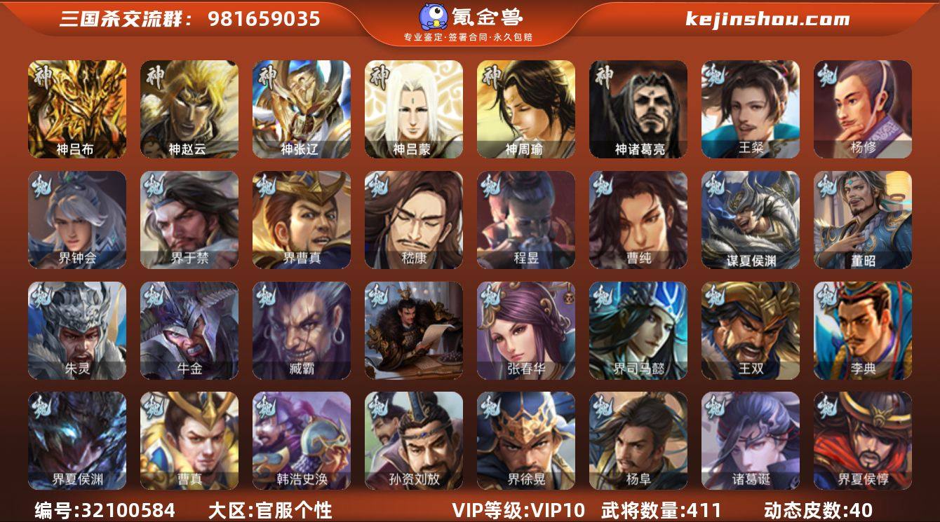 官阶: 大将军 VIP等级: VIP10 武将数量: 411 动态皮肤数量: 40 神将: 神吕布,神张辽,神赵云,神吕蒙,神周瑜,神诸葛亮 魏国武将: 曹纯,程昱,嵇康,界曹真,界于禁,界钟会,杨修,王粲,唐咨-魏,张辽,SP蔡文姬,SP曹仁,SP关羽,SP贾诩,SP姜维,SP庞德,卞夫人,蔡贞姬,曹昂,曹操,曹冲,曹洪,曹丕,曹仁,曹叡,曹嵩,王异,张恭,鲁芝,界满宠,曹休,界曹植,满宠,荀攸,王基,钟繇,蒯越蒯良,郭嘉,荀彧,阮慧,杜畿,界郭嘉,崔琰,界曹丕,界荀彧,朱灵,界甄姬,吕虔,界陈群,界王异,界许褚,界郭淮,华歆,陈群,界邓艾,界典韦,界曹休,袁涣,李通,乐进,辛宪英,郭淮,毛玠,郭皇后,毌丘俭,夏侯惇,曹植,司马朗,谋于禁,界曹操,许褚,界张辽,谋徐晃,张郃,钟会,文聘,曹彰,界夏侯惇,诸葛诞,司马懿,甄姬,杨阜,界徐晃,徐晃,孙资刘放,韩浩史涣,曹真,典韦,界夏侯渊,夏侯渊,李典,于禁,王双,邓艾,界司马懿,张春华,孟达-魏,臧霸,牛金,朱灵(国战),董昭,谋夏侯渊 蜀国武将: 鲍三娘,关索,花鬘,界黄忠,谯周,王平,张星彩,赵襄,周群,诸葛瞻,谋马超,谋赵云,马云騄,徐庶,界魏延,杨仪,吕凯,界关羽,界诸葛亮,邓芝,界伊籍,胡金定,费祎,严颜,界黄月英,界张嶷,赵云,张松,李丰,界刘备,界刘禅,刘封,糜竺,蒋琬,黄月英,关羽,王甫赵累,吴懿,吴班,界廖化,向宠,祝融,张飞,黄皓,陈震,魏延,界周仓,谋祝融,马忠,界法正,糜夫人,界孟获,刘禅,界赵云,界姜维,张翼,关银屏,界祝融,SP孙尚香,SP徐庶,卧龙诸葛,宗预,周仓,简雍,界关兴张苞,诸葛亮,孙乾,界张飞,界卧龙诸葛,法正,界简雍,赵统赵广,陈到,界马岱,关平,马岱,界庞统,庞统,诸葛果,谋张飞,马谡,马超,廖化,关兴张苞,谋关羽,孟获,秦宓,吴苋,夏侯氏,姜维,黄忠,刘备,界马超,李严,马良,傅肜,蒋琬费祎,许靖,刘谌,甘夫人,蜀-糜芳傅士仁,SP甘夫人,势陈到 吴国武将: 贺齐,界步练师,界徐盛,界朱然,留赞,骆统,吴景,周处,潘濬,张温,周泰,全琮,吕蒙,SP庞统,诸葛...