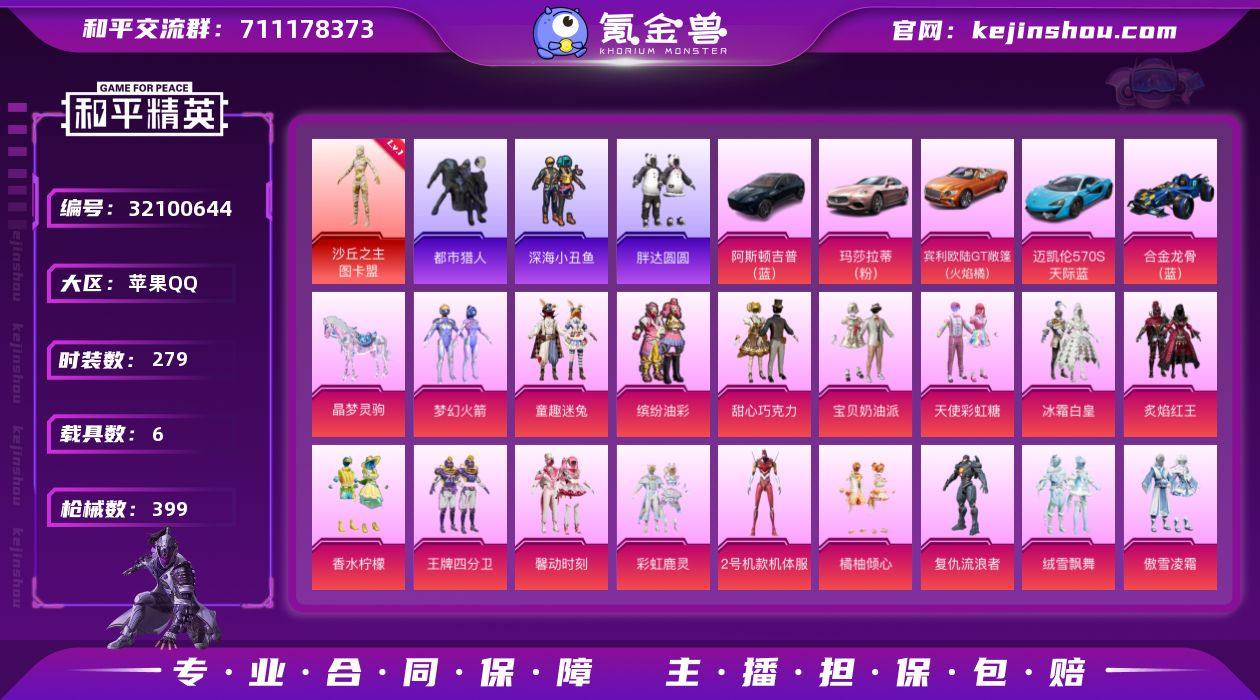苹果 手Q-1神装-28粉装-29特效枪-6载具-10粉色飞行器-148762热力值-23王牌印记-279套装-399枪皮 【红色神装等级】:沙丘之主-图卡盟(一级) 【红色角色神装】:沙丘之主-图卡盟 【热门品类】:粉装-梦幻火箭,粉装-童趣迷兔,粉装-缤纷油彩,套装-浪漫天命,套装-都市猎人,套装-深海小丑鱼,套装-小丑鱼,角色-军刀雅典娜,套装-胖达圆圆,套装-SS1特训,套装-龟仙人,大砍刀-青龙偃月刀,套装-红熊茄茄 【粉色套装】:粉装-甜心巧克力,粉装-宝贝奶油派,粉装-天使彩虹糖,粉装-梦幻火箭,粉装-缤纷油彩,粉装-冰霜白皇,粉装-童趣迷兔,粉装-炙焰红王,粉装-香水柠檬,粉装-王牌四分卫,粉装-馨动时刻,粉装-彩虹鹿灵,角色-2号机款机体服,粉装-橘柚倾心,角色-复仇流浪者,粉装-绒雪飘舞,粉装-傲雪凌霜,粉装-霁雪冰心,角色-白勺歌姬,角色-呆萌星弥,角色-小可学妹,粉装-粉樱探戈,粉装-闲梦青缨,粉装-炫光之旅,角色-圣堂之誓,粉装-星穹咏叹调,角色-绯穹魔姬,角色-辉云木星 【粉色枪皮等级】:AKM-梦之光华(四级),AKM-绿萝繁花(五级),AKM-暮色玫影(三级),M16A4-葫芦兄弟(七级),SCAR-L-童趣迷兔(五级),M416-五爪金龙(二级),M416-至情至圣(九级),M416-天马神君(三级),GROZA-香水柠檬(五级),GROZA-镜光银凌(五级),AUG-南国舞曲(六级),AUG-超新星(一级),AUG-暖羊咩咩(五级),M762-甜蜜誓约(五级),UMP45-玉魂晶魄(八级),Vector-环太平洋(二级),AKS-74U-星穹咏叹调(五级),AKS-74U-森灵之息(四级),P90-能量风暴(五级),Kar98K-巳巳如意(五级),M24-莲影清波(五级),AWM-橘柚倾心(五级),Mk14-福马献瑞(五级),AMR-炫光之旅(五级),AA12-G-萌骑幻想(二级),DP-28-豹影疾电(五级),MG3-梦幻舞会(五级),MG-36-沧焰双生(五级) 【粉色载具】:阿斯顿马丁DBX(蓝),玛莎拉蒂Ghibli(粉),宾利...