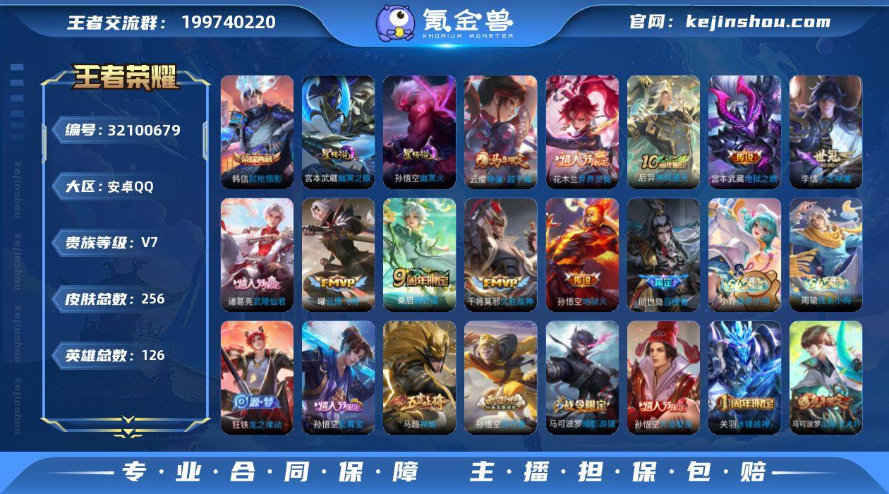 王者19300,不可二次,安卓Q-V7-尊贵铂金II段位-126英雄-256皮肤-1典藏皮肤-10传说-61史诗 【英雄全皮】:猪八戒全皮 【荣耀典藏】:韩信弑枪猎影 【传说皮肤】:云缨神骥越千峰,花木兰异界灵契,后羿神树通天,桑启鸣野蒿,曜云鹰飞将,李信一念神魔,干将莫邪久胜战神,诸葛亮武陵仙君,宫本武藏地狱之眼,孙悟空地狱火 【限定皮肤】:姜子牙天穹之誓,狄仁杰阴阳师,赵云皇家上将,墨子神迹守卫,孙尚香蔷薇恋人,庄周高山流水,高渐离玩趣恶龙,阿轲迷踪丽影,钟无艳超时空战士,芈月幻夜卜梦,吕布御风骁将,元歌云间偶戏,元歌无心,夏侯惇朔风刀,甄姬落雪兰心,马可波罗暗影游猎,马可波罗山海玄木吟,狄仁杰魔术师,狄仁杰万华元夜,达摩沙漠行僧,项羽海滩派对,老夫子醍醐杖,老夫子航海奇遇记,关羽冰锋战神,程咬金演武夺筹,刘邦夺宝奇兵,韩信逐梦之影,韩信傲雪梅枪,兰陵王金庭之子,亚瑟潮玩骑士王,孙悟空至尊宝,孙悟空大圣娶亲,孙悟空孙行者,牛魔御旌,李元芳银河之约,李元芳云中旅人,钟馗驱傩正仪,雅典娜黎明之约,鬼谷子原初探秘者,鬼谷子五谷丰年,诸葛亮武陵仙君,黄忠火炮绅士,苏烈千军破阵,弈星混沌棋,沈梦溪星空之诺,沈梦溪大漠名商,明世隐疑决卦,裴擒虎李小龙,裴擒虎擒涛扼浪,米莱狄御霄,云中君纤云弄巧,伽罗天狼溯光者,盾山御銮,猪八戒西部大镖客,猪八戒猪悟能,上官婉儿天狼绘梦者,鲁班大师探海日志,桑启海盐诗旅,艾琳女武神,张良古海寻踪,妲己灵卜魔法,鬼谷子天穹祈灯 【年限皮肤】:吕布御风骁将,马可波罗山海玄木吟 【赛季限定】:米莱狄御霄,牛魔御旌,盾山御銮,夏侯惇朔风刀,弈星混沌棋,明世隐疑决卦,老夫子醍醐杖,鬼谷子原初探秘者,狄仁杰万华元夜,程咬金演武夺筹,钟馗驱傩正仪,苏烈千军破阵,达摩沙漠行僧,兰陵王金庭之子,沈梦溪大...