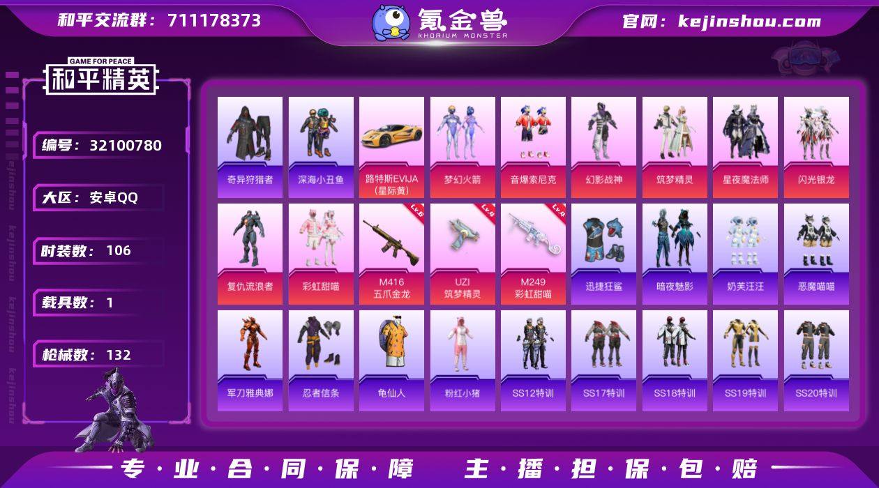 安卓 手Q-8粉装-3特效枪-1载具-2粉色飞行器-45885热力值-7王牌印记-106套装-132枪皮 【热门品类】:粉装-梦幻火箭,粉装-音爆索尼克,套装-深海小丑鱼,套装-奇异狩猎者,角色-军刀雅典娜,套装-忍者信条,套装-龟仙人,套装-粉红小猪 【粉色套装】:粉装-幻影战神,粉装-梦幻火箭,粉装-筑梦精灵,粉装-星夜魔法师,粉装-闪光银龙,角色-复仇流浪者,粉装-彩虹甜喵,粉装-音爆索尼克 【粉色枪皮等级】:M416-五爪金龙(六级),UZI-筑梦精灵(四级),M249-彩虹甜喵(四级) 【粉色载具】:路特斯EVIJA(星际黄) 【粉色枪皮】:M416-五爪金龙,UZI-筑梦精灵,M249-彩虹甜喵 【粉色飞行器】:闪光银龙飞行器,太空嘟嘟飞行器 【粉色降落伞】:幻影战神降落伞,香水柠檬降落伞,洛神天依降落伞,碧影闪光降落伞,筑梦精灵降落伞,炙焰牛王降落伞,星夜魔法师降落伞,环太平洋降落伞,彩虹甜喵降落伞,音爆索尼克降落伞,仲夏莫吉托降落伞 【稀有套装】:套装-龟仙人 【稀有枪皮】:AKM-夜灯,AKM-彩虹符号,AKM-灼热熔岩,AKM-王牌投手,AKM-环太平洋,AKM-破晓战魂,AKM-筑梦精灵,AKM-龙的传人,M16A4-幻世战舞者,M16A4-甜心亚梦,M16A4-红色方程式,M16A4-蓝色火焰,SCAR-L-玉兔迎春,SCAR-L-碧影闪光,SCAR-L-青丘仙客,M416-暗夜行者,M416-红色方程式,M416-蓝色火焰,GROZA-异彩先驱,GROZA-彩虹符号,GROZA-懵萌河马,GROZA-田园牧歌,AUG-天降萌叽,AUG-幻影战神,AUG-耀粉歌者,QBZ-彩虹符号,QBZ-未来歌姬,QBZ-飞驰魅影,M762-天降萌叽,M762-彩虹甜喵,M762-牛气冲天,M762-瑞龙福将,Mk47-洛神天依,G36C-懵萌河马,G36C-炙焰牛王,G36C-青丘仙客,AC-VAL-天降萌叽,AC-VAL-彩虹甜喵,AC-VAL-甜心亚梦,蜜獾-天降萌叽,蜜獾-娇憨猪猪,UZI-娇憨猪猪,UZI-炫彩节奏,UMP45-涂山之恋,UMP45-生命誓言,UMP4...