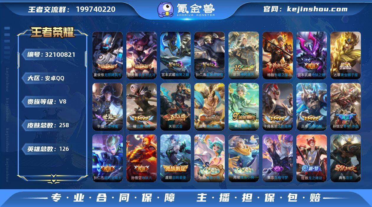 王者19422,无二次,安卓Q-V8-最强王者段位-126英雄-258皮肤-2典藏皮肤-15传说-61史诗 【英雄全皮】:孙权全皮 【荣耀典藏】:夏侯惇无限飓风号,孙尚香杀手不太冷 【传说皮肤】:后羿神树通天,桑启鸣野蒿,吕布遇见神鼓,吕布怒海麟威,虞姬启明星使,孙悟空零号赤焰,关羽武圣,曜云鹰飞将,李信一念神魔,干将莫邪久胜战神,达摩黄金狮子座,杨戬永曜之星,宫本武藏地狱之眼,孙悟空地狱火,狄仁杰超时空战士 【限定皮肤】:白起狰,暃埋骨钱,狄仁杰阴阳师,虞姬凯尔特女王,廉颇寅虎御盾,赵云皇家上将,孙尚香蔷薇恋人,庄周蜃楼王,庄周高山流水,高渐离玩趣恶龙,阿轲迷踪丽影,孙膑妖精王,扁鹊炼金王,吕布遇见神鼓,元歌云间偶戏,夏侯惇朔风刀,典韦岱宗,马可波罗暗影游猎,狄仁杰魔术师,狄仁杰万华元夜,达摩沙漠行僧,项羽海滩派对,老夫子醍醐杖,关羽武圣,程咬金演武夺筹,刘邦夺宝奇兵,兰陵王金庭之子,亚瑟狮心王,亚瑟潮玩骑士王,孙悟空零号赤焰,后羿如梦令,张飞虎魄,李元芳银河之约,虞姬启明星使,钟馗驱傩正仪,杨戬永曜之星,雅典娜单词大作战,雅典娜黎明之约,蔡文姬繁星吟游,鬼谷子原初探秘者,鬼谷子五谷丰年,铠青龙志,苏烈千军破阵,百里玄策原初追逐者,弈星混沌棋,沈梦溪星空之诺,沈梦溪大漠名商,明世隐疑决卦,裴擒虎李小龙,米莱狄御霄,云中君纤云弄巧,盾山御銮,猪八戒西部大镖客,蒙犽狂想玩偶喵,艾琳流音漫舞,司空震地狱燃心,阿古朵江河有灵,张良古海寻踪,高渐离燃音魔法,妲己灵卜魔法,鬼谷子天穹祈灯,沈梦溪龙舞盛年,刘邦剑破天穹,周瑜熔金海岸 【年限皮肤】:杨戬永曜之星,铠青龙志,典韦岱宗,廉颇寅虎御盾 【赛季限定】:亚瑟狮心王,庄周蜃楼王,孙膑妖精王,扁鹊炼金王,虞姬凯尔特女王,白起狰,米莱狄御霄,盾山御銮,夏侯惇朔风刀,弈星...