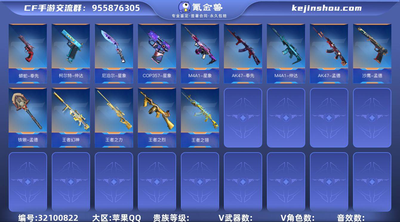 【FC-82W3HE】【10至尊-5同框30王者1紫电-奉先套仁德套星象套孟德宙斯本初妙才幻神威震天】苹果QQ,成人号:是,角色等级:172,实名:有修改人脸机会/实名是本人,段位:枪圣S,VIP等级:V9,V武器数量:374,V角色数量:16,V总数量:285,王者武器数:26,万化数量:397,音效皮肤数:6, 【人物角色】云悠悠,关小雨,樱,幽灵刀锋-觉醒,复仇者,葵,萝拉,审判者,曼陀罗,潘多拉,斯沃特,零-新生,炽天使-X,蝉,蜀雪,月神,雅典娜,妲姬,麻雀,职场灵狐,斯薇特, 【王者武器】王者之盘,王者之尊,王者之兽,王者之魄-冠军珍藏,雷霆王者之锋,M4A1-雷霆王者,王者之心,王者之影,王者之翼,王者之戮,王者之怒,王者之魂,王者之灵,王者之轮,王者之电,王者之锋,王者之啸,王者之击,王者之烈,王者之圣,王者之迹,王者之痕,王者之神,王者幻神,王者之狱,王者之隐, 【至尊套装】影至尊,翼至尊,戮至尊,怒至尊,心至尊,圣至尊,魄至尊,狱至尊,王者幻神至尊套,烈至尊, 【带V枪械】尼泊尔-星象,龙啸,巴雷特-毁灭,尼泊尔-火麒麟,地狱烈炎,尼泊尔-雷霆,M4A1-心动次元觉醒,马来剑-毁灭,AWM-天龙-曼陀罗,柯尔特-仲达,SCAR-探星者,虎头湛金枪,屠龙,AK47-Rush-星速,AWM-天使,夺魂,G36-竞技战魂,巴雷特-冬灭觉醒,M4A1-哈迪斯,墨刃-幻神,M4A1-赛博雷神,M4A1-雷霆,沙鹰-超新星,M4A1-竞界荣光,MG36-变形金刚·威震天,血月,M4A1-威侯,铁锹-游骑兵,98K-星神,M4A1-樱龙·超觉,VEPR12-宙斯,M4A1-星象,M4A1-卧龙,M4A1-枪娘,激光短刃-黑骑士,M4A1-沙漠领主,CZS2-血月,M4A1-游骑兵,QCW05-变形金刚·大黄蜂,AK47-破空冰刃,M4A1-玫瑰精灵,M4A1-死神,M4A1-黑龙,M4A1-黑骑士,M4A1-雷神,打击者-天神,47-云舞,G36-竞技亚魂,47-机械纪元,47-仁德,AK47-波塞冬,AK47-血武士...