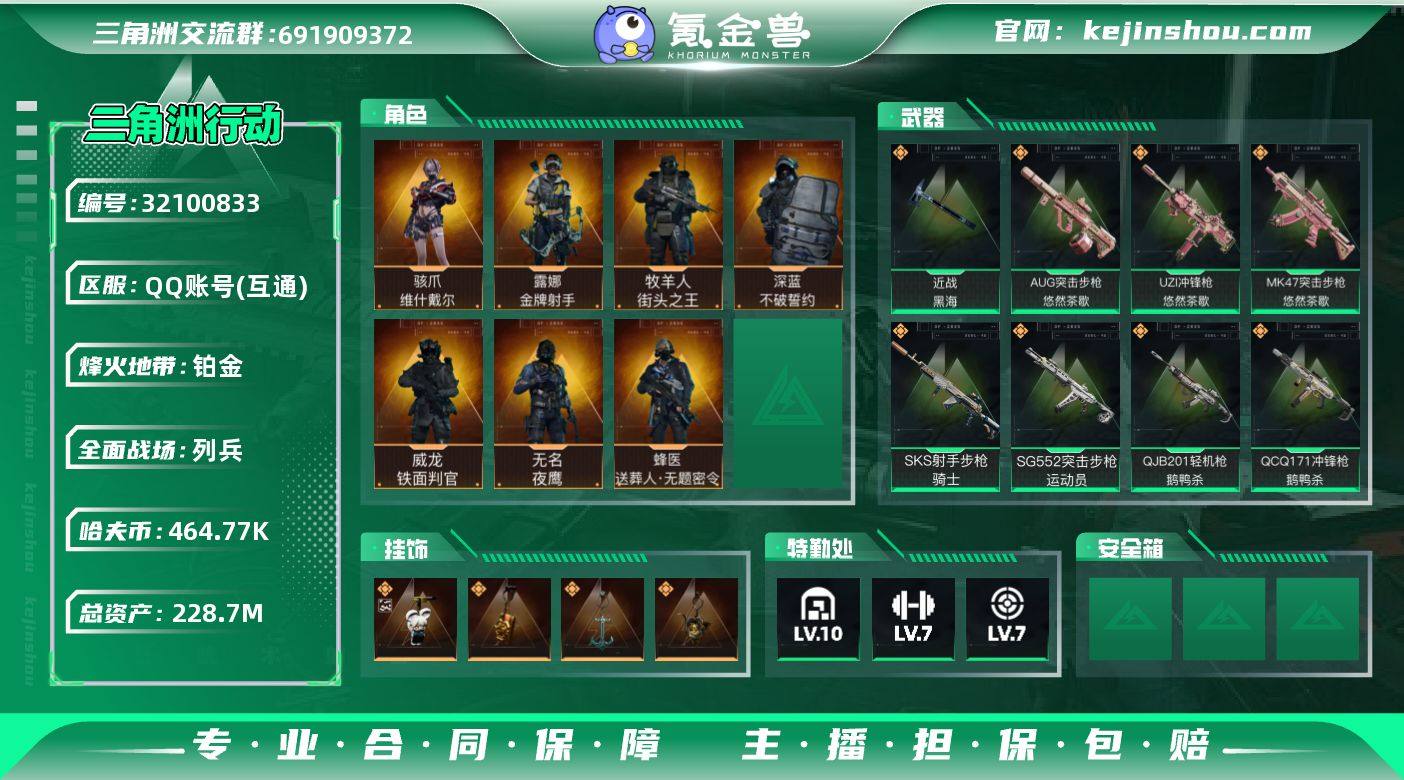 实名:可二次实名 总资产:228.7M 哈夫币:464.77K 烽火地带段位:铂金 烽火地带等级:60 全面战场段位:列兵 全面战场等级:29 10级仓库,7级训练中心,7级靶场,6级指挥中心,3级潜水中心,3级防具台,3级工作台,3级制药台,3级技术中心,2级收藏室 战术部门等级:4 战斗部门等级:4 医疗部门等级:4 研发部门等级:4 后勤部门等级:4 曼德尔砖-气象感应:0 曼德尔砖-命运王牌:0 曼德尔砖-电玩高手:0 曼德尔砖-美杜莎:0