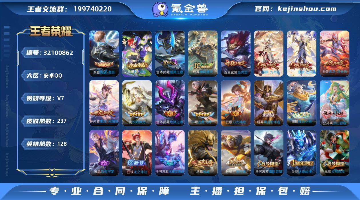 王者19517,不可二次,,2219星币,金标孙策,安卓Q-V7-最强王者段位-128英雄-237皮肤-1典藏皮肤-1珍品传说-11传说-73史诗 【英雄全皮】:孙权全皮,影全皮 【荣耀典藏】:李白鸣剑曳影 【珍品传说】:孙策时之奇旅 【传说皮肤】:后羿神树通天,司空震愿照山河定,澜愿照九州拓,云缨幻光神枪,孙尚香乘龙问璇玑,孙策乘龙淬吴钩,镜炽阳神光,曜云鹰飞将,百里玄策白虎志,后羿黄金射手座,宫本武藏地狱之眼 【限定皮肤】:狄仁杰阴阳师,赵云皇家上将,墨子神迹守卫,孙尚香蔷薇恋人,庄周高山流水,高渐离死亡摇滚,芈月幻夜卜梦,元歌云间偶戏,甄姬游园惊梦,马可波罗暗影游猎,狄仁杰魔术师,狄仁杰万华元夜,达摩星际陆战队,达摩沙漠行僧,项羽海滩派对,老夫子醍醐杖,老夫子航海奇遇记,关羽冰锋战神,程咬金演武夺筹,兰陵王金庭之子,亚瑟潮玩骑士王,孙悟空孙行者,李元芳云中旅人,虞姬霸王别姬,钟馗驱傩正仪,干将莫邪冰霜恋舞曲,雅典娜单词大作战,雅典娜黎明之约,太乙真人华丽摇滚,鬼谷子原初探秘者,黄忠火炮绅士,苏烈千军破阵,百里玄策白虎志,百里玄策原初追逐者,梦奇顽趣,沈梦溪大漠名商,明世隐疑决卦,裴擒虎李小龙,裴擒虎擒涛扼浪,米莱狄胡桃异想国,云中君纤云弄巧,猪八戒西部大镖客,嫦娥拒霜思,蒙犽狂想玩偶喵,鲁班大师探海日志,桑启海盐诗旅,阿古朵江河有灵,张良古海寻踪,蒙犽百解令,蒙恬荣光圣徽,高渐离燃音魔法,妲己灵卜魔法,鬼谷子天穹祈灯,伽罗琥珀纪元,姬小满妄想食味,孙尚香乘龙问璇玑,孙策乘龙淬吴钩,沈梦溪龙舞盛年,刘邦剑破天穹,程咬金群星魔术团 【年限皮肤】:百里玄策白虎志,孙尚香乘龙问璇玑,孙策乘龙淬吴钩,司空震愿照山河定,澜愿照九州拓 【赛季限定】:明世隐疑决卦,老夫子醍醐杖,鬼谷子原初探秘者,狄仁杰万华元夜,程咬金演武...
