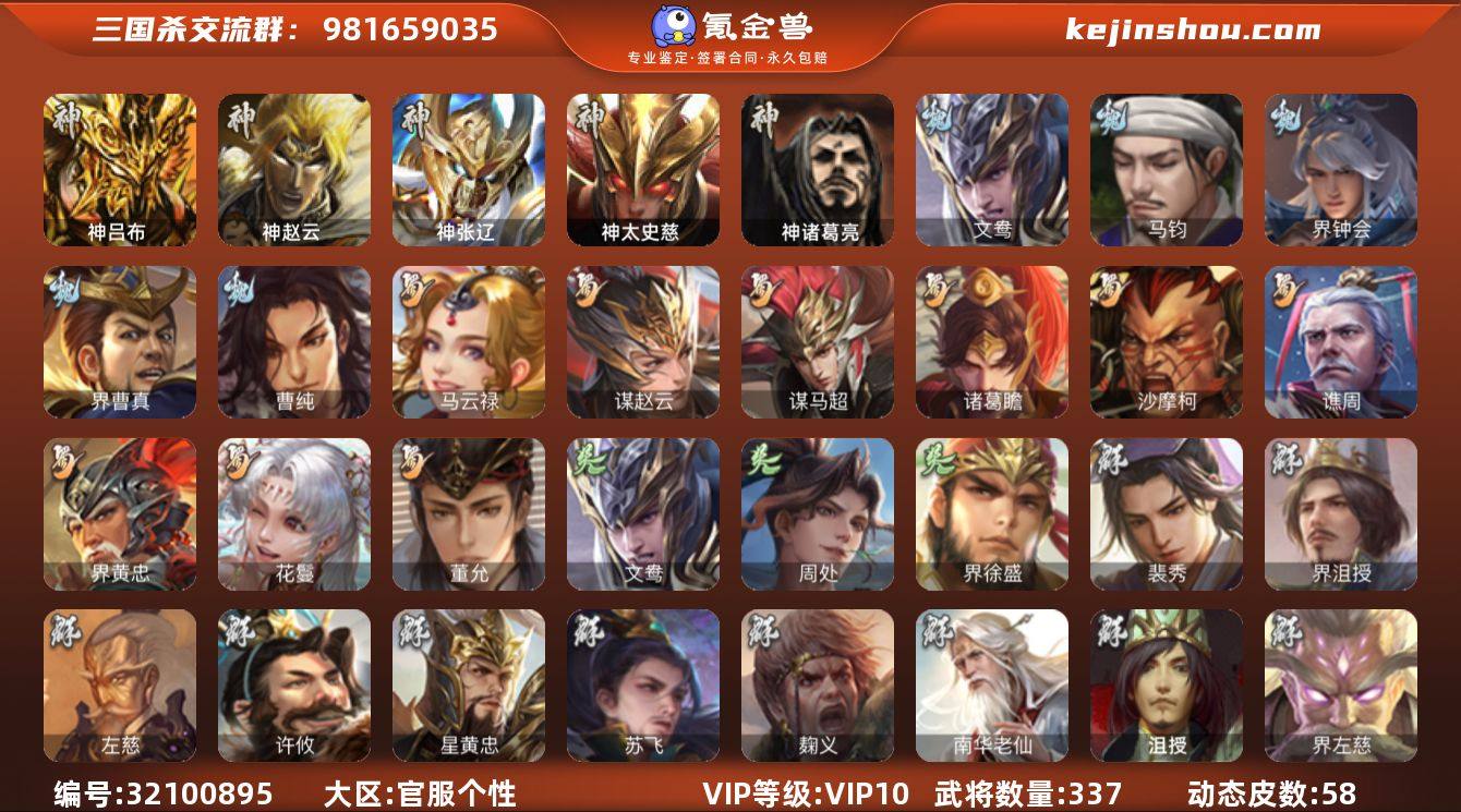【725】官阶:大将军;VIP等级:VIP10;史诗武将数量:34;动态皮肤数量:58;武将总数:337;史诗宝珠数量:53;将魂数量:596;神将:7;魏国史诗武将:13;蜀国史诗武将:9;吴国史诗武将:2;群史诗武将:14 神吕布,神赵云,神张辽,神太史慈,神吕蒙,神周瑜,神诸葛亮,文鸯,马钧,界钟会,界曹真,曹纯,马云騄,谋赵云,谋马超,诸葛瞻,沙摩柯,谯周,界黄忠,花鬘,董允,周处,界徐盛,谋黄月英,裴秀,界沮授,左慈,星黄忠,苏飞,麹义,南华老仙,沮授,界左慈,界李儒,杜预,张绣,许攸,神张辽-威震江东,神刘备-龙兴海内,神关羽-佑子伐吴,神诸葛亮-孟章诛邪(动态),神吕布-冠绝天下(动态),神赵云-战龙在野(动态),曹丕-气荡山河(动态),甄姬-明珠耀躯(动态),荀彧-驱虎吞狼(动态),邓艾-神兵天降(动态),张春华-雪中舞刃(动态),SP蔡文姬-冠绝天下(动态),曹婴-兔年春节(动态),刘备-龙御天下(动态),诸葛亮-龙年限定(动态),卧龙诸葛-龙跃凤鸣(动态),马超-明良千古(动态),诸葛瞻-绵竹之殇(动态),关银屏-兔年春节(动态),马云騄-花海舞枪(动态),张星彩-虎年端午(动态),关索-虎年七夕(动态),鲍三娘-虎年七夕(动态),李丰-太仓聚粟(动态),周处-义除三害(动态),孙权-永开吴祚(动态),孙策-虎踞江东(动态),孙寒华-威灵尽显(动态),孙权-猪年端午(动态),孙权-牛年七夕(动态),大乔-猪年七夕(动态),界大乔-猪年七夕(动态),界孙权-猪年端午(动态),界孙权-牛年七夕(动态),徐盛-破军杀将(动态),孙鲁育-牛年端午(动态),文鸯-势若万钧(动态),袁绍-声震寰宇(动态),杜预-龙吟破竹(动态),张角-迅雷风烈(动态),袁绍-一往无前(动态),界张角-迅雷风烈(动态),李儒-鸠杀少帝(动态),界李儒-鸠杀少帝(动态),刘焉-雄踞益州(动态),苏飞-肝胆相照(动态)