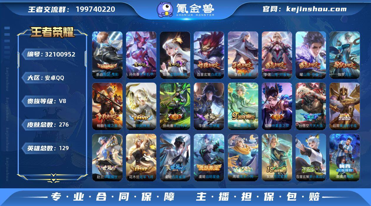 王者19513,4842星币,安卓Q-V8-最强王者段位-129英雄-276皮肤-1典藏皮肤-1典藏英雄-17传说-69史诗 【英雄全皮】:敖隐全皮,影全皮 【荣耀典藏】:武则天英雄,李白鸣剑曳影 【传说皮肤】:桑启鸣野蒿,孙悟空齐天大圣,曜山海苍雷引,李信山海炽霜斩,赵云淬星耀世,镜炽阳神光,虞姬启明星使,李信一念神魔,伽罗太华,虞姬云霓雀翎,百里玄策白虎志,花木兰冠军飞将,后羿黄金射手座,杨戬永曜之星,貂蝉仲夏夜之梦,李白凤求凰,孙尚香末日机甲 【限定皮肤】:白起狰,姜子牙天穹之誓,狄仁杰阴阳师,虞姬凯尔特女王,赵云皇家上将,墨子神迹守卫,妲己时之彼端,嬴政白昼王子,庄周高山流水,钟无艳超时空战士,芈月重明,芈月幻夜卜梦,吕布猎兽之王,周瑜赤莲之焰,夏侯惇朔风刀,甄姬落雪兰心,曹操烛龙,典韦穷奇,典韦蓝屏警告,马可波罗山海玄木吟,狄仁杰魔术师,狄仁杰万华元夜,达摩沙漠行僧,项羽海滩派对,老夫子醍醐杖,老夫子航海奇遇记,关羽冰锋战神,程咬金演武夺筹,露娜一生所爱,王昭君凤凰于飞,兰陵王驯魔猎人,兰陵王金庭之子,花木兰青春决赛季,花木兰瑞麟志,孙悟空大圣娶亲,孙悟空孙行者,孙悟空齐天大圣,牛魔御旌,李元芳银河之约,李元芳云中旅人,虞姬启明星使,钟馗神迹守卫,钟馗驱傩正仪,杨玉环遇见飞天,杨戬永曜之星,女娲朔望之晖,雅典娜黎明之约,蔡文姬繁星吟游,太乙真人饕餮,鬼谷子原初探秘者,鬼谷子五谷丰年,黄忠火炮绅士,苏烈千军破阵,百里玄策白虎志,百里玄策原初追逐者,弈星混沌棋,梦奇顽趣,沈梦溪星空之诺,沈梦溪大漠名商,明世隐疑决卦,裴擒虎李小龙,裴擒虎擒涛扼浪,狂铁御狮,米莱狄御霄,李信山海炽霜斩,伽罗太华,盾山御銮,猪八戒猪悟能,上官婉儿梁祝,嫦娥拒霜思,曜山海苍雷引,鲁班大师探海日志,桑启海盐诗旅,艾琳女武神,阿古朵...