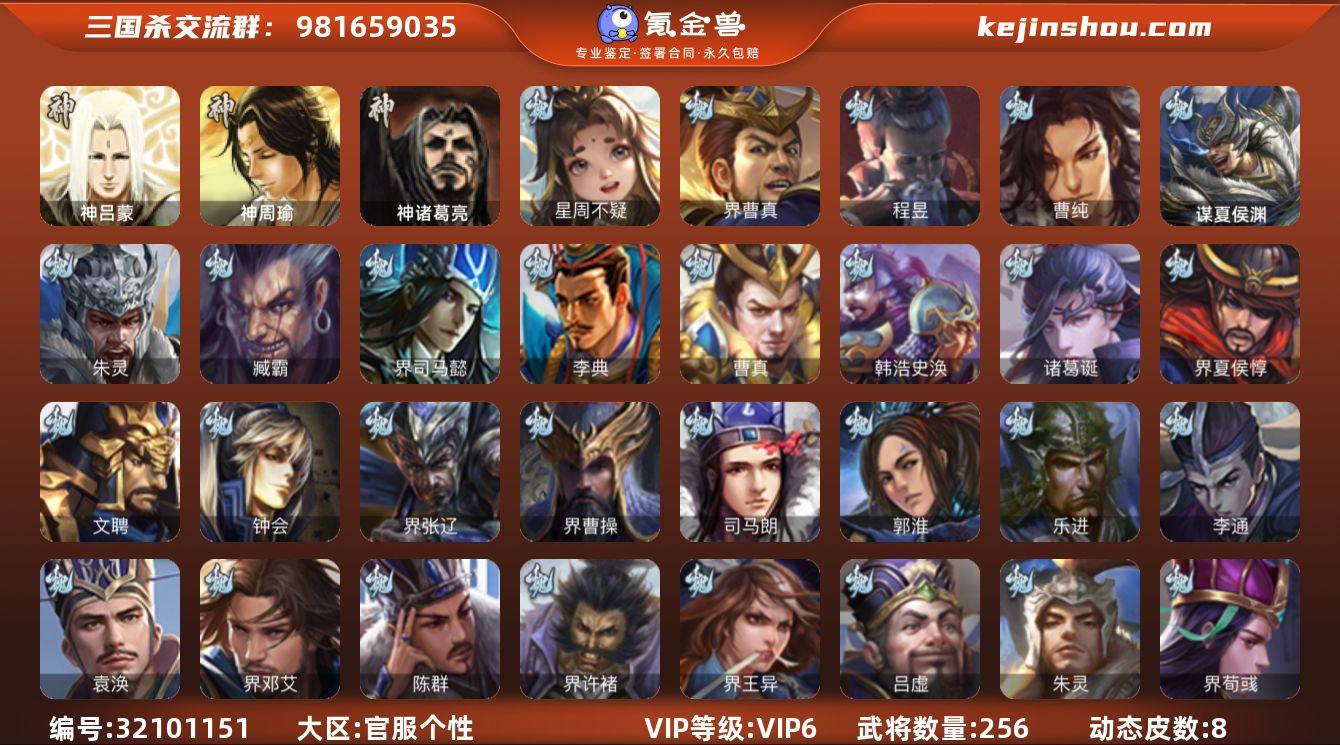 官阶: 骠骑将军 VIP等级: VIP6 武将数量: 256 动态皮肤数量: 8 神将: 神吕蒙,神周瑜,神诸葛亮 魏国武将: 曹纯,程昱,界曹真,张辽,SP蔡文姬,SP关羽,SP姜维,SP庞德,曹昂,曹操,曹冲,曹丕,曹仁,曹叡,王异,鲁芝,界曹植,荀攸,王基,钟繇,郭嘉,荀彧,杜畿,界郭嘉,崔琰,界荀彧,朱灵,吕虔,界王异,界许褚,陈群,界邓艾,袁涣,李通,乐进,郭淮,夏侯惇,曹植,司马朗,谋于禁,界曹操,星周不疑,许褚,界张辽,谋徐晃,张郃,钟会,文聘,界夏侯惇,诸葛诞,司马懿,甄姬,徐晃,韩浩史涣,曹真,典韦,夏侯渊,李典,于禁,邓艾,界司马懿,臧霸,朱灵(国战),谋夏侯渊 蜀国武将: 赵襄,谋马超,谋赵云,谋夏侯氏,徐庶,杨仪,界关羽,界伊籍,费祎,界黄月英,界张嶷,赵云,张松,彭羕,李丰,界刘备,界刘禅,谋姜维,刘封,谋庞统,黄月英,刘巴,关羽,吴懿,吴班,祝融,张飞,魏延,马忠,界法正,糜夫人,刘禅,界赵云,关银屏,SP孙尚香,SP徐庶,卧龙诸葛,周仓,简雍,界关兴张苞,诸葛亮,界张飞,法正,陈到,界马岱,关平,马岱,界庞统,庞统,诸葛果,谋张飞,马谡,马超,廖化,关兴张苞,孟获,夏侯氏,姜维,黄忠,刘备,李严,马良,傅肜,蒋琬费祎,刘谌,彭羕(国战),甘夫人,势陈到 吴国武将: 界徐盛,陆绩,周泰,吕蒙,界顾雍,大乔小乔,许贡,丁奉,谋吕蒙,蒋钦,顾雍,阚泽,界朱治,孙休,严畯,界凌统,祖茂,濮阳兴,界虞翻,界吕蒙,凌操,谋黄盖,孙尚香,程普,大乔,韩当,陆逊,诸葛瑾,吕范,太史慈,虞翻,界黄盖,孙鲁班,界周瑜,卫温诸葛直,孙权,界孙鲁班,界甘宁,甘宁,界大乔,孙坚,孙鲁育,凌统,岑昏,步练师,周瑜,小乔,潘璋马忠,黄盖,吕岱,孙策,界陆逊,界周泰,徐盛,张昭张纮,陈武蕫袭,界张昭张纮,朱桓 群国武将: 杜预,界左慈,沮授,兀突骨,左慈,伏完,华雄,董白,刘琦,袁术,高顺,刘繇,于吉,界公孙瓒,吕布,李儒,公孙瓒,王濬,蔡夫人,樊稠,界张角,星张郃,潘凤,界袁术,陈宫,SP马超,蹋顿,界华佗,贾诩,羊祜,庞德,张宝,刘表,董卓,何太...