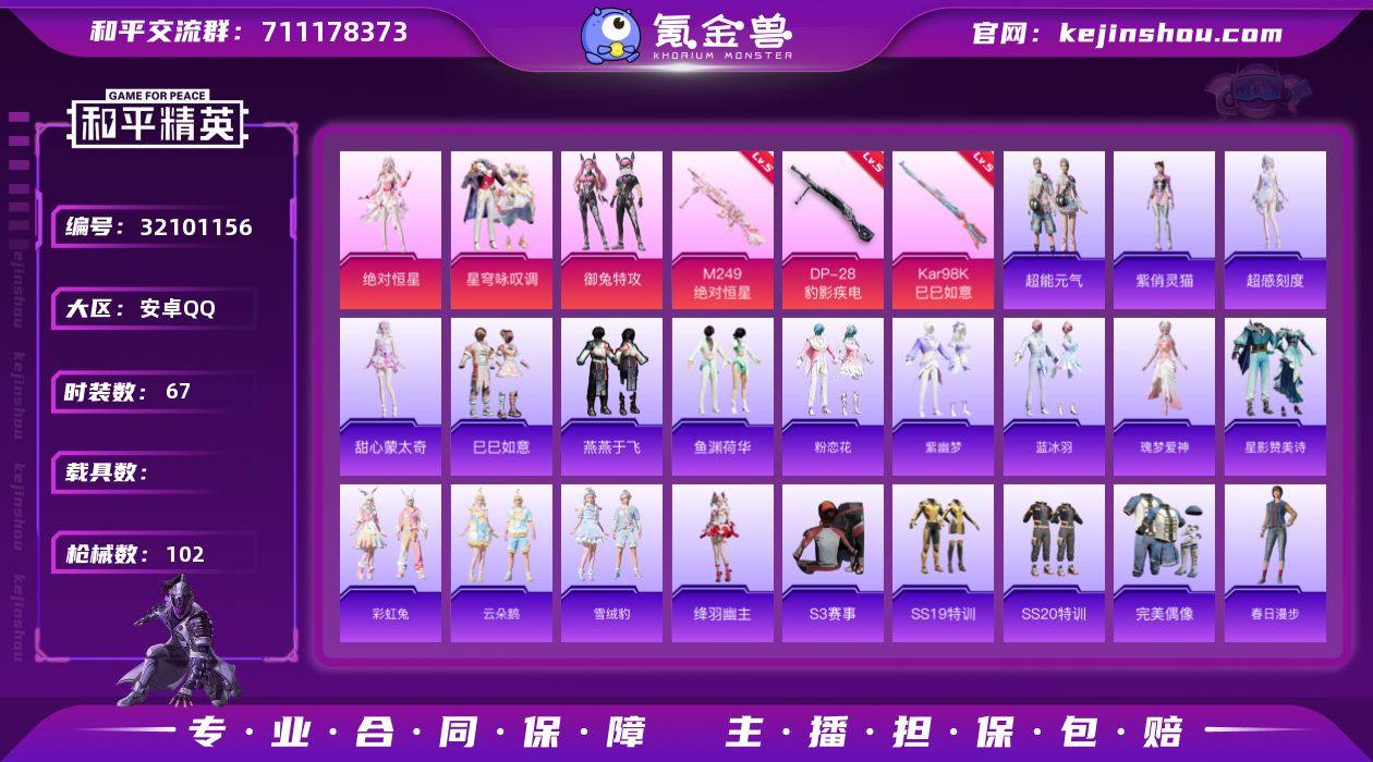 【ashp76】安卓 手Q-3粉装-4特效枪-0载具-5粉色飞行器-27108热力值-7王牌印记-67套装-102枪皮 连体【传说皮肤】:干将莫邪久胜战神,墨子黄金天蝎座,后羿神树通天,桑启鸣野蒿 【其他皮肤】:孙悟空美猴王 安卓Q-V0-至尊星耀III段位-125英雄-145皮肤-4传说 【粉色套装】:角色-绝对恒星,粉装-星穹咏叹调,粉装-御兔特攻 【粉色枪皮等级】:Kar98K-巳巳如意(五级),M249-绝对恒星(五级),DP-28-豹影疾电(五级) 【粉色枪皮】:Kar98K-巳巳如意,Mk14-福马献瑞,M249-绝对恒星,DP-28-豹影疾电 【粉色飞行器】:绝对恒星飞行器,炫彩糖果飞行器,御兔特攻飞行器,时光之吻飞行器,极意拳锋飞行器 【粉色降落伞】:绝对恒星降落伞,星穹咏叹调降落伞,御兔特攻降落伞,时光之吻降落伞,喜羊羊与灰太狼降落伞,炫彩糖果降落伞 【稀有套装】:套装-巳巳如意,套装-超能元气,角色-超感刻度,角色-甜心蒙太奇,套装-雪国风尚,套装-炫彩糖果,套装-燕燕于飞,套装-鱼渊荷华,套装-粉恋花,套装-紫幽梦,套装-蓝冰羽,角色-瑰梦爱神,套装-星影赞美诗,套装-彩虹兔,套装-云朵鹅,套装-雪绒豹,角色-绛羽幽主,角色-紫俏灵猫 【稀有枪皮】:AUG-冰晶雪宝,M16A4-生命誓言,SCAR-L-炫彩节奏,SCAR-L-玉兔迎春,SCAR-L-生命誓言,M416-蓝色火焰,AUG-绝对恒星,M762-天降萌叽,M762-云朵鹅,M762-登顶巅峰,AC-VAL-时光之吻,蜜獾-御兔特攻,UZI-啾咪啾咪,UZI-天降萌叽,UZI-生命誓言,汤姆逊-耀粉歌者,P90-巳巳如意,Kar98K-彩虹符号,M24-幻彩电音,Mini14-春暖花开,Mini14-生命誓言,Mini14-耀粉歌者,AMR-喜羊羊与灰太狼,AMR-鬼刀,MK20-H-樱桃泡泡,SVD-云朵鹅,S686-红色方程式,S12K-玩趣呆呆,S12K-智耀战神,DBS-彩虹符号,DBS-幻彩电音,SPAS-12-云朵鹅,M249-破晓战魂,M249-糯团青竹,MG3-幻世战舞者,MG3...