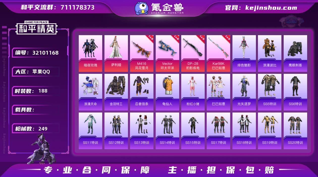 不可二次 苹果 手Q-2粉装-7特效枪-0载具-1粉色飞行器-74579热力值-13王牌印记-188套装-249枪皮 QW263305 【热门品类】:套装-浪漫天命,套装-金羽特工,套装-忍者信条,套装-龟仙人,套装-浪漫波比,套装-粉红小猪 【粉色套装】:粉装-暗夜玫瑰,角色-萨利娅 【粉色枪皮等级】:M416-风花雪月(六级),Vector-环太平洋(六级),AKS-74U-森灵之息(五级),Kar98K-巳巳如意(五级),Mk14-福马献瑞(五级),AA12-G-萌骑幻想(三级),DP-28-豹影疾电(五级) 【粉色枪皮】:M416-风花雪月,Vector-环太平洋,AKS-74U-森灵之息,Kar98K-巳巳如意,Mk14-福马献瑞,AA12-G-萌骑幻想,DP-28-豹影疾电 【粉色飞行器】:炫彩糖果飞行器 【粉色降落伞】:快乐主宰降落伞,幻影战神降落伞,百万伏特降落伞,甜心宝贝降落伞,古堡领主降落伞,王牌四分卫降落伞,齐天大圣降落伞,风花雪月降落伞,海渊国主降落伞,飒粉甜心降落伞,炎氏战神降落伞,炫光之旅降落伞,炫彩糖果降落伞 【稀有套装】:套装-龟仙人,套装-巳巳如意,套装-雪国风尚,套装-炫彩糖果,套装-暖暖麦兜,角色-阿虎,套装-马上来财,角色-光矢逐梦,角色-绯色魅影,套装-雨过天青,套装-红釉青花,角色-霜纹水星 【稀有枪皮】:AUG-冰晶雪宝,AKM-2P战斗服款,AKM-夜灯,AKM-奇异狩猎者,AKM-彩虹符号,AKM-灼热熔岩,AKM-玉龙,AKM-生命誓言,AKM-破晓战魂,AKM-萌趣颜团子,AKM-虎虎生威,AKM-龙的传人,M16A4-幻世战舞者,M16A4-机械英豪,M16A4-甜心亚梦,M16A4-红色方程式,M16A4-蓝色火焰,SCAR-L-炫彩节奏,SCAR-L-玉兔迎春,SCAR-L-甜蜜誓约,SCAR-L-红色方程式,SCAR-L-黄金龙骨,M416-夜灯,M416-滑板小狐,M416-糯团青竹,M416-红色方程式,M416-绿野极光,M416-蓝色火焰,GROZA-异彩先驱,GROZA-彩虹符号,GROZA-治愈之星,GROZA-田园牧歌,GROZA-蓝莓炮...