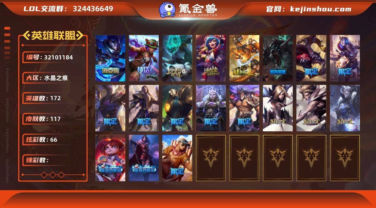 单双黄金段位-172英雄-117皮肤-66炫彩-0终极-4神话-17限定-13传说-21史诗 【神话皮肤】:十周年纪念安妮,源代码乐芙兰,十五周年纪念希维尔,海克斯科技嘉文四世 【年限皮肤】:碧玉之牙卡西奥佩娅,美猴王孙悟空 【海克斯皮肤】:海克斯科技嘉文四世 【冰雪限定】:幸福女神乐芙兰,圣诞玩偶波比 【限定皮肤】:iG卡莎,iG洛,EDG格雷福斯,胜利女神奥莉安娜,胜利之剑亚托克斯,胜利枪神卢锡安,胜利机器人布里茨,胜利女神瑟庄妮,胜利之王泰达米尔,泳池派对李青,暗影沃里克,都铎王朝图奇 【传说皮肤】:战场女武神凯尔,恶魔男爵瑞兹,提莫约德尔人的一大步,女皇艾希,女主播迦娜,未来战士凯特琳,上古战魂魔腾,黯黑魔龙希瓦娜,焰尾妖狐阿狸,宇航员诺提勒斯,泳池派对吉格斯,西部魔影卢锡安,星之守护者霞 【史诗皮肤】:圣光审判凯尔,圣洁化身索拉卡,兔宝宝提莫,殇之机器人阿木木,熔火之心拉莫斯,前线指挥官卡特琳娜,蓝焰梦魔魔腾,暗星嘉文四世,铁血猎手奈德丽,冰川勇者伊泽瑞尔,帝王斑蝶克格莫,战国大名慎,沙之守护泽拉斯,海牛猎手菲兹,天启骑士杰斯,邪恶魔人扎克,源代码卡蜜尔,职业杀手卢锡安,源计划自由艾克,河水之灵娜美,幽冥领主阿兹尔 【王者皮肤】:西部牛仔崔斯特,战地之王加里奥 【其他皮肤1】:风执事加里奥,未来战士崔斯特,秘密特工赵信,黑暗骑士阿利斯塔,哞利斯塔,原野伐木工赛恩,西部牛仔厄运小姐,黑暗骑士艾希,宗师级钓鱼训练师贾克斯,遗迹守护者基兰,科学狂人辛吉德,假面女皇伊芙琳,尼斯巨兽科加斯,王子不是我阿木木,铬金铠甲拉莫斯,健美教练蒙多,莲花之令艾瑞莉娅,女帝迦娜,老兵普朗克,柯基库奇,白魔法师维迦,石破天惊墨菲特,闭月之颜貂蝉,战斗学院卡特琳娜,星河战队雷克顿,血石战神雷克顿,末日余生布兰德,狂热球迷古拉加斯,足...
