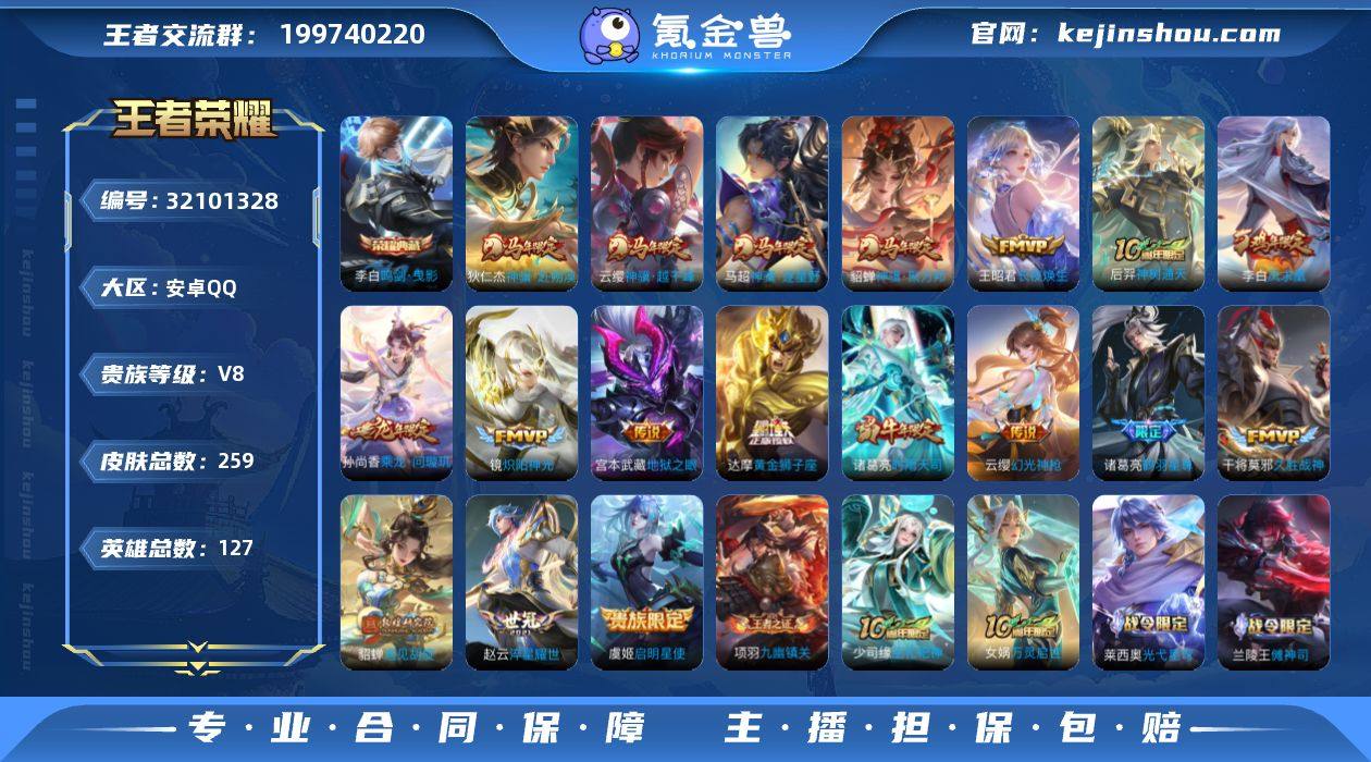 【王者荣耀】珍品无双0 典藏1 无双0 珍品传说0 传说20 史诗69 英雄127 皮肤259 贵族8级 荣耀典藏:鸣剑·曳影__传说皮肤:孙尚香-异界灵契|炽阳神光|启明星使|地狱之眼|久胜战神|黄金狮子座|刘备-时之恋人|淬星耀世|鹤羽星尊|凤求凰|时雨天司|遇见胡旋|乘龙·问璇玑|幻光神枪|神树通天|长夜焕生|神骥·赴朔漠|神骥·越千峰|神骥·逐星野|神骥·聚万邦__稀有限定:至尊宝|朱雀志|虞姬-霸王别姬|一生所爱|蔷薇恋人|蜜橘之夏|孙行者|李小龙|梁祝|狮舞东方|暗影游猎|百里守约-真我赫兹|大漠名商|高山流水|古海寻踪|海滩派对|海盐诗旅|航海奇遇记|胡桃夹子|华丽摇滚|皇家上将|混沌棋|金庭之子|凯尔特女王|蓝屏警告|黎明之约|炼金王|魔术师|千军破阵|擒涛扼浪|驱傩正仪|荣光圣徽|沙漠行僧|朔风刀|探海日志|醍醐杖|天狼绘梦者|天穹祈灯|万华元夜|星界游侠|星空之诺|驯魔猎人|演武夺筹|疑决卦|阴阳师|银河之约|游园惊梦|御旌|御銮|御狮|原初追逐者|真爱魔法|暗渊魔法|冰冠公主|冰雪圆舞曲|德古拉伯爵|电玩小子|鬼剑武藏|黄金分割率|节奏热浪|金属风暴|龙骑士|梦奇-顽趣|女仆咖啡|偶像歌手|圣诞狂欢|圣诞恋歌|水果甜心|水晶猎龙者|天秀·启明|晚萤|赵云-未来纪元|鹰眼统帅|幽灵船长|逐浪之夏|紫霞仙子|曙光守护者|千年之狐|心灵骇客|茶境仙|星界战将|谧流熔炉|苍鳞隐世|绮世丹青|化蝶舞|御霄|狰|烛龙|重明|朔望之晖|钟馗-神迹守卫|访茗客|圣弓游侠|墨子-神迹守卫|龙之律动|布丁狗之约|虚灵犬护|逆浪荇歌|黄忠-百相守梦|涂山容容|光弋星穹|傩神司|往忆晖光|百里玄策-罗小黑战记|荣光之誓|万灵启世|巫礼祀神|鹤鸣心笺|九幽镇关|小乔-线条小狗|周瑜-线条小狗__优质皮肤:尼罗河女神|一千零一夜|创世神祝|年年有余|埃及法老|孤猎|熊喵少女|午夜歌剧院|激情绿茵|海之征途|天启骑士|锦衣卫|森|超能战警|维京掠夺者|海军大将|绯红之刃|启蛰|战...