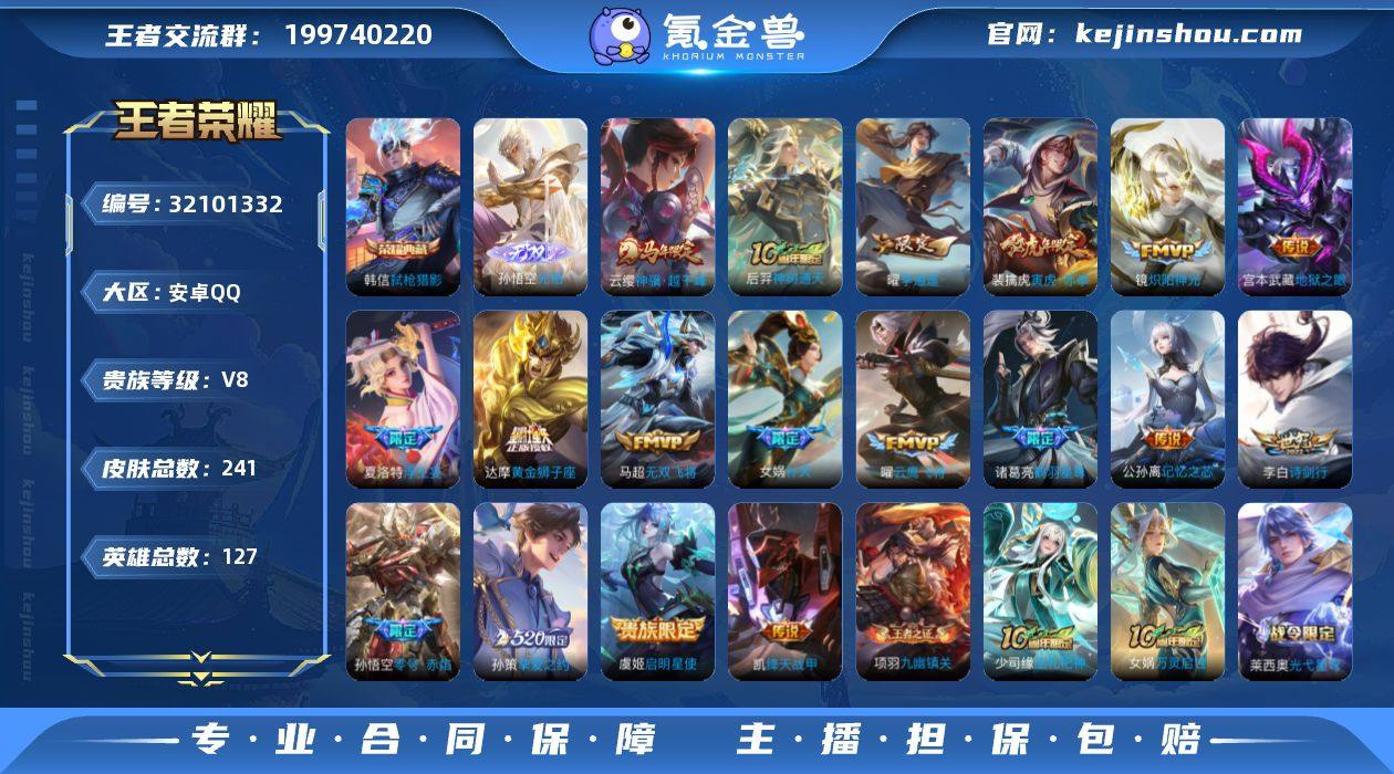 【王者荣耀】珍品无双0 典藏1 无双1 珍品传说0 传说21 史诗78 英雄127 皮肤241 贵族8级 荣耀典藏:弑枪猎影__无双皮肤:无相__传说皮肤:无双飞将|挚爱之约|补天|绛天战甲|炽阳神光|启明星使|地狱之眼|黄金狮子座|云鹰飞将|李逍遥|浮生妄|鹤羽星尊|记忆之芯|孙尚香-末日机甲|兰陵王-默契交锋|零号·赤焰|诗剑行|逐花归海|寅虎·赤拳|神树通天|神骥·越千峰__稀有限定:寅虎·心曲|玄嵩|蜜橘之夏|傲雪梅枪|李小龙|山海·玄木吟|神器·万象笔|拒霜思|百解令|冰霜恋舞曲|大漠名商|电玩高手|古海寻踪|海滩派对|海盐诗旅|航海奇遇记|幻夜卜梦|皇家上将|混沌棋|火炮绅士|剑破天穹|江河有灵|金庭之子|黎明之约|魔术师|匿光追影者|女武神|千军破阵|擒涛扼浪|驱傩正仪|荣光圣徽|沙漠行僧|死亡摇滚|探海日志|醍醐杖|天狼狩猎者|天穹祈灯|万华元夜|王者之锤|妄想食味|无心|五谷丰年|午后时光|纤云弄巧|星空之诺|演武夺筹|疑决卦|阴阳师|银河之约|原初追逐者|云间偶戏|逐梦之星|暗隐猎兽者|暗渊魔法|缤纷独角兽|冰冠公主|冰雪圆舞曲|苍穹之光|乘风破浪|大乔-猫狗日记|德古拉伯爵|地狱岩魂|电玩·爆裂旋风|金属风暴|龙骑士|吕布-末日机甲|魅力维加斯|魅语|梦奇-顽趣|女仆咖啡|偶像歌手|赏金猎手|圣诞狂欢|水果甜心|孙策-猫狗日记|天秀·启明|赵云-未来纪元|星夜王子|鹰眼统帅|永昼|幽灵船长|紫霞仙子|噬灭天穹|埋骨钱|天穹之誓|修罗|千年之狐|关羽-百相守梦|无限星赏官|舞动绿茵|特工魅影|星界战将|谧流熔炉|原初探秘者|云中旅人|墨子-神迹守卫|死神来了|灵蛊蚀心|龙之律动|布丁狗之约|虚灵犬护|逆浪荇歌|黄忠-百相守梦|织梦人|光弋星穹|傩神司|往忆晖光|荣光之誓|万灵启世|巫礼祀神|鹤鸣心笺|九幽镇关|小乔-线条小狗|周瑜-线条小狗__优质皮肤:创世神祝|孤猎|木偶奇遇记|熊喵少女|午夜歌剧院|激情绿茵|海之征途|碧珀绯影|秩序猎龙将|森|超能...