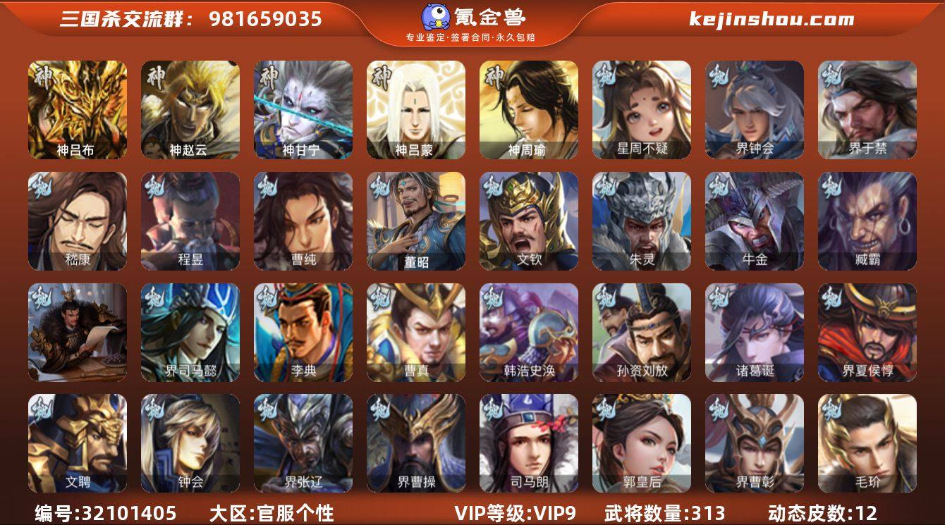 官阶: 骠骑将军 VIP等级: VIP9 武将数量: 313 动态皮肤数量: 12 神将: 神甘宁,神吕布,神赵云,神吕蒙,神周瑜 魏国武将: 曹纯,程昱,嵇康,界于禁,界钟会,唐咨-魏,张辽,SP蔡文姬,SP关羽,SP贾诩,SP姜维,SP庞德,卞夫人,曹昂,曹操,曹冲,曹洪,曹丕,曹仁,曹叡,曹嵩,王异,张恭,鲁芝,界满宠,曹休,界曹植,满宠,荀攸,王基,钟繇,郭嘉,荀彧,阮慧,杜畿,界郭嘉,崔琰,界曹丕,界荀彧,朱灵,界王异,界许褚,界郭淮,华歆,陈群,界邓艾,界典韦,袁涣,李通,乐进,辛宪英,郭淮,毛玠,界曹彰,郭皇后,夏侯惇,曹植,司马朗,界曹操,星周不疑,许褚,界张辽,张郃,钟会,文聘,曹彰,界夏侯惇,诸葛诞,司马懿,甄姬,徐晃,孙资刘放,韩浩史涣,曹真,典韦,夏侯渊,李典,于禁,邓艾,界司马懿,孟达-魏,臧霸,牛金,朱灵(国战),文钦-魏,董昭 蜀国武将: 花鬘,谯周,沙摩柯,张星彩,诸葛瞻,谋马超,谋赵云,徐庶,界魏延,界关羽,界诸葛亮,邓芝,费祎,严颜,界黄月英,界张嶷,赵云,张松,彭羕,李丰,界刘备,刘封,糜竺,黄月英,刘巴,关羽,吴懿,吴班,界廖化,祝融,张飞,魏延,界周仓,马忠,界法正,糜夫人,刘禅,界赵云,界姜维,张翼,关银屏,SP孙尚香,SP徐庶,卧龙诸葛,周仓,简雍,界关兴张苞,诸葛亮,界张飞,法正,赵统赵广,界马岱,关平,马岱,界庞统,庞统,诸葛果,谋张飞,马谡,马超,廖化,关兴张苞,孟获,夏侯氏,姜维,黄忠,刘备,界马超,李严,马良,傅肜,蒋琬费祎,刘谌,彭羕(国战),甘夫人,蜀-糜芳傅士仁,势陈到 吴国武将: 界徐盛,潘濬,周泰,全琮,吕蒙,诸葛恪,界孙尚香,界顾雍,大乔小乔,桥公,许贡,丁奉,谋吕蒙,孙茹,蒋钦,顾雍,谋孙权,孙亮,孙休,严畯,界孙权,孙翊,界孙休,界凌统,祖茂,濮阳兴,界虞翻,界吕蒙,孙登,凌操,朱治,孙尚香,程普,大乔,韩当,陆逊,诸葛瑾,朱然,太史慈,周妃,虞翻,界黄盖,孙鲁班,界周瑜,孙权,界小乔,鲁肃,界甘宁,吴国太,甘宁,界大乔,孙坚,孙鲁育,凌统,步练师,周瑜,小乔,潘璋马忠,黄盖,孙...