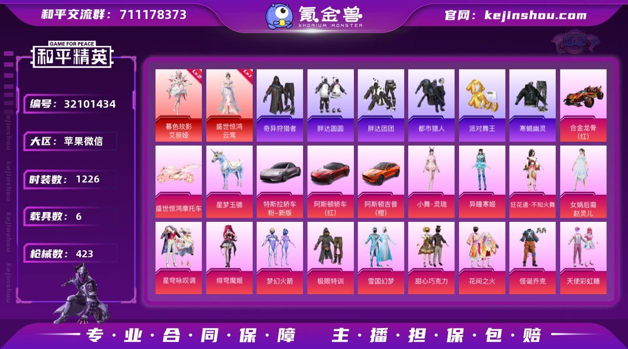 【1693】苹果 微信-4神装-76粉装-25特效枪-8载具-20粉色飞行器-213858热力值-22王牌印记-425套装-519枪皮 【红色载具】:宾利飞驰(皇家紫)(三级) 【红色神装等级】:梦海之灵-妮芮妲(一级),墨龙九天-敖渊(一级),镜域双华-欧若拉(一级),沙丘之主-图卡盟(三级) 【红色角色神装】:梦海之灵-妮芮妲,墨龙九天-敖渊,镜域双华-欧若拉,沙丘之主-图卡盟 【热门品类】:粉装-怪诞乔克,粉装-雪国幻梦,粉装-梦幻火箭,粉装-童趣迷兔,粉装-音爆索尼克,粉装-缤纷油彩,套装-浪漫天命,套装-赤蝎幽灵,套装-都市猎人,套装-冥河战士,套装-派对舞王,套装-深海小丑鱼,套装-小丑鱼,套装-胖达团团,套装-胖达圆圆,套装-动感兔斯基人偶服,套装-龟仙人,套装-潮萌小黄鸭,套装-暗影哥特,套装-浪漫波比,套装-粉红小猪,套装-摄影小熊猫,套装-红红火火,套装-糯粉咩咩,套装-软软马卡龙,角色-Mark.06,套装-红熊茄茄 【粉色套装】:粉装-怪诞乔克,粉装-甜心巧克力,粉装-宝贝奶油派,粉装-天使彩虹糖,粉装-雪国幻梦,粉装-蝶舞迷情,粉装-梦幻火箭,粉装-智能音符,粉装-缤纷油彩,粉装-放客神游,粉装-新星烈龙,粉装-星空之魅,粉装-花间之火,粉装-冰霜白皇,粉装-童趣迷兔,粉装-炙焰红王,粉装-相思残雪,粉装-馨动时刻,粉装-炙焰赤龙,粉装-飓风飞鹰,粉装-蜜桃特工,角色-闪耀迪迦,粉装-彩虹鹿灵,粉装-山涧鹿灵,角色-洛天依,角色-2号机款机体服,粉装-甜心娃娃,粉装-精灵娃娃,粉装-酣梦娃娃,粉装-焦糖拿铁,粉装-岚岚物语,粉装-恐龙拽拽,粉装-绚丽摇曳,粉装-闪耀律动,粉装-橘柚倾心,粉装-紫电风暴,粉装-甜梦小狐,粉装-暖熊萌萌,粉装-霁雪冰心,粉装-灵感创作师,女娲后裔-赵灵儿,粉装-旋转彩虹,粉装-冰川粉黛,粉装-冰川幽秘,粉装-冰川红玫,粉装-霞光圣骑,粉装-寒光使者,粉装-暗夜...