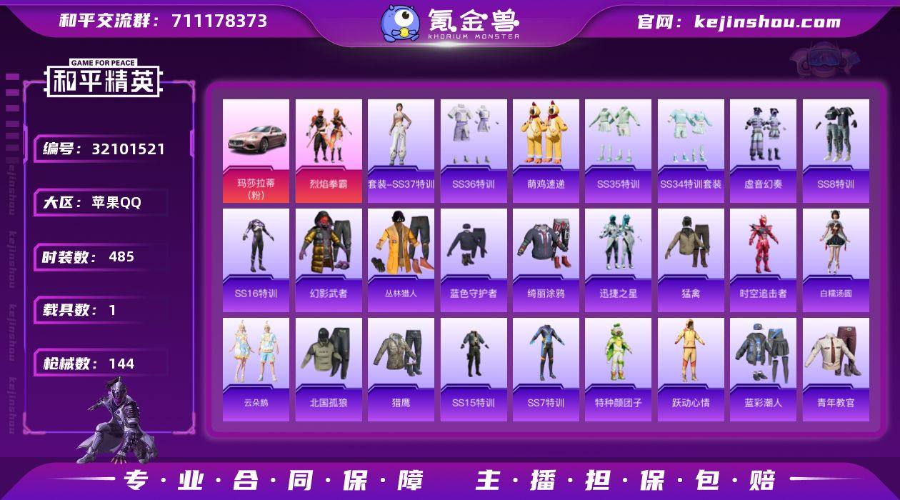 实名:可二次实名 是否支持人脸包赔:支持 粉装数量:1 载具数:1 时装数:485 枪械数:144 烈焰拳霸 玛莎拉蒂Ghibli(粉) SS37特训,SS36特训,萌鸡速递,SS35特训,SS34特训套装,爱崽白熊,冰川特警,暴风机械师,北国孤狼,滨海假日,壁垒格斗者,白糯汤圆,爆竹金鼠,长空猛禽,丛林猎人,潮流先锋,潮流游乐家,传奇侦探,春日漫步,炽焰拳师,都市魅力,疯狂小兔子,福星高照,飞行日记,格斗专家,诡谋托雷基亚,诡面顽熊,光影梦想家,虎虎生威吉莉,湖蓝色名流,黑色伏地魔,黄色伏地魔,海上生明月,黄色运动,红色运动,幻世战舞者,幻影武者,竞技名士,竞技勇士朋克,吉莉礼服,坚韧舞者,极速红龙,精神漫游,金鼠迎春,街头潮人,科技之星,空投萌叽,蓝彩潮人,凛冬战士,猎鹰,蓝色守护者,蓝色运动,冷焰舞者,猛禽,萌黄之夏,萌趣颜团子,迷域探索者,霓虹街区,怒火燎原,破蛋小黄鸡,破晓战魂,青春冒险家,拳皇97八神庵,奇迹天团,绮丽涂鸦,青年教官,清香五月粽,云朵鹅,瑞龙福将,燃烧卡路里,熔岩使者,忍者信条,圣诞大吉,深海格斗者,时空追击者,森林猎手,深蓝冒险家,SS13特训,SS14特训,SS15特训,SS16特训,SS17特训,SS18特训,SS19特训,SS20特训,SS32特训套装,SS33特训套装,SS3特训,SS4特训,SS5特训,SS6特训,SS7特训,SS8特训,探宝勇士,天籁歌者,甜蜜告白,特训学院,甜心亚梦,团圆交子,特种颜团子,特战装甲,完美偶像,迅捷之星,炫蓝之夏,雪绒豹,夏日音浪,雪山精英,雪山征服者,核芯基因,虚音幻奏,跃动心情,耀粉歌者,阳光火鸡,银河圣歌,野性战魂,夜莺强袭者,战地督导,灼焰舞者,治愈之星 卖家说:粉色玛莎拉蒂便宜急出