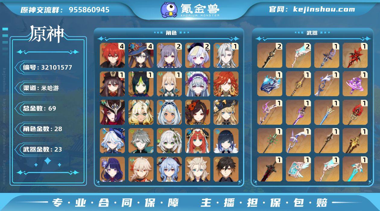 邮箱: 不送邮/死邮 总黄数: 69 冒险等级: 60 4命金色角色: 四命迪卢克,四命莫娜 2命金色角色: 二命七七,二命刻晴 1命金色角色: 一命琴,一命胡桃,一命提纳里,一命那维莱特 0命金色角色: 温迪,枫原万叶,达达利亚,钟离,阿贝多,甘雨,雷电将军,夜兰,妮露,纳西妲,艾尔海森,迪希雅,芙宁娜,娜维娅,千织,玛拉妮,希诺宁,恰斯卡,玛薇卡,梦见月瑞希 拥有武器: 狼的末路,天空之翼,雾切之回光,飞雷之弦振,四风原典,天空之卷,和璞鸢,阿莫斯之弓,天空之刃,贯虹之槊,斫峰之刃,护摩之杖,苍古自由之誓,神乐之真意,若水,赤沙之杖,苇海信标,万世流涌大典,赤月之形,赦罪 2精武器: 天空之翼,斫峰之刃 1精武器: 狼的末路,天空之翼,雾切之回光,飞雷之弦振,四风原典,天空之卷,和璞鸢,阿莫斯之弓,天空之刃,贯虹之槊,护摩之杖,苍古自由之誓,神乐之真意,若水,赤沙之杖,苇海信标,万世流涌大典,赤月之形,赦罪