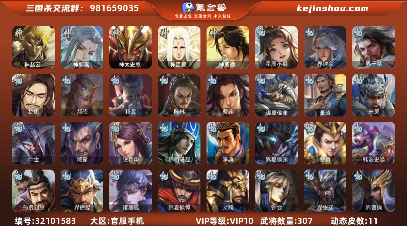 官阶: 骠骑将军 VIP等级: VIP10 武将数量: 307 动态皮肤数量: 11 神将: 神郭嘉,神太史慈,神赵云,神吕蒙,神周瑜 魏国武将: 曹纯,陈琳,程昱,郝昭,嵇康,界于禁,界钟会,张辽,SP蔡文姬,SP关羽,SP姜维,SP庞德,卞夫人,曹昂,曹操,曹冲,曹洪,曹丕,曹仁,曹叡,曹嵩,王异,鲁芝,界满宠,曹休,界曹植,满宠,荀攸,王基,钟繇,蒯越蒯良,郭嘉,牵招,荀彧,阮慧,杜畿,界郭嘉,崔琰,界荀彧,朱灵,界甄姬,辛毗,吕虔,界王异,界许褚,界郭淮,华歆,陈群,界邓艾,袁涣,李通,乐进,郭淮,郭皇后,毌丘俭,夏侯惇,曹植,司马朗,谋于禁,界曹操,星周不疑,许褚,界张辽,谋徐晃,张郃,钟会,文聘,曹彰,界夏侯惇,诸葛诞,司马懿,甄姬,界徐晃,徐晃,孙资刘放,韩浩史涣,曹真,典韦,界夏侯渊,夏侯渊,李典,于禁,邓艾,界司马懿,张春华,臧霸,牛金,朱灵(国战),董昭,谋夏侯渊 蜀国武将: 花鬘,傅佥,周群,诸葛瞻,谋赵云,谋黄忠,徐庶,杨仪,吕凯,界关羽,界诸葛亮,界伊籍,费祎,严颜,界黄月英,界张嶷,赵云,张松,彭羕,李丰,界刘备,谋姜维,刘封,糜竺,李遗,谋庞统,黄月英,刘巴,关羽,吴懿,向宠,祝融,张飞,黄皓,魏延,界周仓,界法正,糜夫人,界孟获,刘禅,界赵云,界姜维,张翼,界祝融,SP孙尚香,SP徐庶,卧龙诸葛,周仓,简雍,谋孟获,界关兴张苞,诸葛亮,界张飞,法正,赵统赵广,陈到,界马岱,关平,马岱,界庞统,庞统,诸葛果,谋张飞,马谡,马超,廖化,关兴张苞,孟获,夏侯氏,姜维,黄忠,刘备,界马超,马良,傅肜,蒋琬费祎,刘谌,彭羕(国战),甘夫人,蜀-糜芳傅士仁 吴国武将: 潘濬,周泰,吕蒙,诸葛恪,界孙尚香,大乔小乔,谋周瑜,丁奉,谋吕蒙,孙茹,蒋钦,顾雍,孙亮,界朱治,孙休,严畯,界孙权,界孙休,祖茂,濮阳兴,界虞翻,凌操,朱治,孙尚香,程普,大乔,韩当,陆逊,诸葛瑾,朱然,太史慈,周妃,虞翻,界黄盖,孙鲁班,界周瑜,界潘璋马忠,卫温诸葛直,孙权,界孙鲁班,鲁肃,界甘宁,吴国太,甘宁,界大乔,孙坚,孙鲁育,凌统,岑昏,步练师,...