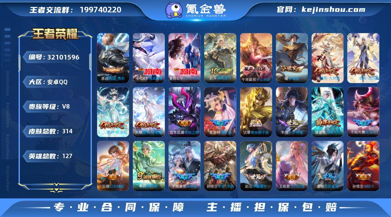 【王者荣耀】珍品无双0 典藏1 无双0 珍品传说2 传说23 史诗89 英雄127 皮肤314 贵族7级 荣耀典藏:鸣剑·曳影__珍品传说:江户川柯南|怪盗基德__传说皮肤:鸣野蒿|启明星使|地狱之眼|地狱火|云霓雀翎|黄金狮子座|黄金白羊座|一念神魔|李逍遥|乞巧织情|淬星耀世|绯月行|浮生妄|画中仙|零号·赤焰|时雨天司|幻光神枪|愿照·山河定|愿照·九州拓|愿照·众生和|愿照·千秋盛|千山共赴|神树通天__稀有限定:一生所爱|岱宗|蔷薇恋人|蜜橘之夏|神威|乒乒小将|孙行者|李小龙|神器·万象笔|暗影游猎|百解令|冰霜恋舞曲|大漠名商|繁星吟游|古海寻踪|海滩派对|海盐诗旅|航海奇遇记|胡桃异想国|皇家上将|剑破天穹|江河有灵|金庭之子|狂想玩偶喵|黎明之约|魔法小厨娘|魔术师|女武神|千军破阵|擒涛扼浪|驱傩正仪|荣光圣徽|沙漠行僧|探海日志|醍醐杖|天狼溯光者|天狼运算者|天穹祈灯|万华元夜|妄想食味|无心|五谷丰年|纤云弄巧|演武夺筹|疑决卦|阴阳师|游园惊梦|原初追逐者|云间偶戏|逐梦之影|暗夜猫娘|暗隐猎兽者|白蛇|缤纷独角兽|冰冠公主|冰雪圆舞曲|乘风破浪|大乔-猫狗日记|德古拉伯爵|地狱岩魂|功夫厨神|鬼剑武藏|箭羽风息|节奏热浪|金属风暴|龙骑士|吕布-末日机甲|魅力维加斯|梦奇-顽趣|女仆咖啡|绅士熊喵|圣诞狂欢|圣诞恋歌|水果甜心|水晶猎龙者|孙策-猫狗日记|天才门将|晚萤|星夜王子|摇滚巨星|鹰眼统帅|幽灵船长|月团寄思|逐浪之夏|紫霞仙子|噬灭天穹|敬我三分|东方月初|埋骨钱|顽岩魄|天穹之誓|浮光幕影|海诺-心动手记|修罗|千年之狐|特工魅影|心灵骇客|星界战将|谧流熔炉|苍鳞隐世|器灵·浮梦炉|糖绘人间|绮世丹青|原初探秘者|云中旅人|单词大作战|达摩-星际陆战队|墨子-神迹守卫|灵蛊蚀心|龙之律动|布丁狗之约|虚灵犬护|逆浪荇歌|涂山容容|荣光之誓|万灵启世|鹤鸣心笺|九幽镇关|周瑜-线条小狗|锁墨魂|瓦猫非猫__优质皮肤:尼罗河女...