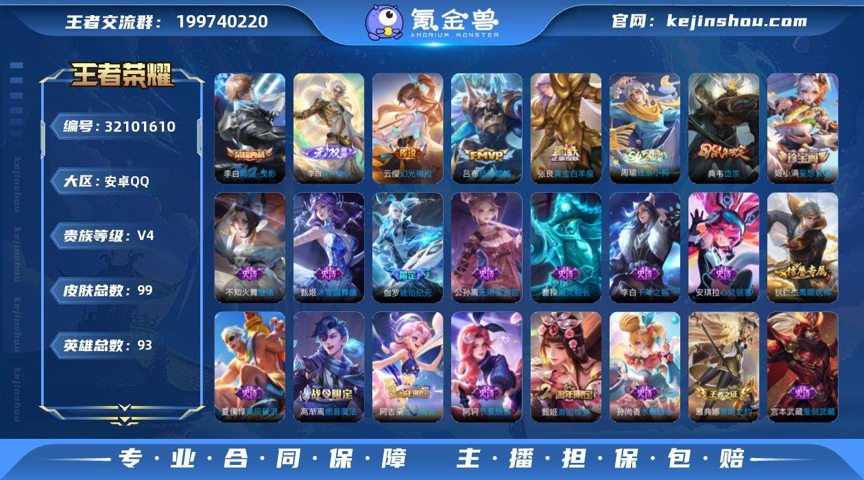 【秒换绑】安卓Q-V4-尊贵铂金III段位-93英雄-99皮肤-1典藏皮肤-1无双-3传说-25史诗 【荣耀典藏】:李白鸣剑曳影 【无双皮肤】:李白碎月剑心 【传说皮肤】:云缨幻光神枪,吕布怒海麟威,张良黄金白羊座 【限定皮肤】:姜子牙天穹之誓,狄仁杰阴阳师,甄姬游园惊梦,典韦岱宗,项羽海滩派对,雅典娜黎明之约,鲁班大师探海日志,阿古朵江河有灵,张良古海寻踪,蒙犽百解令,高渐离燃音魔法,妲己灵卜魔法,鬼谷子天穹祈灯,李白碎月剑心,伽罗琥珀纪元,姬小满妄想食味,沈梦溪龙舞盛年,刘邦剑破天穹,程咬金群星魔术团,周瑜熔金海岸 【年限皮肤】:典韦岱宗 【赛季限定】:鲁班大师探海日志,张良古海寻踪,鬼谷子天穹祈灯,刘邦剑破天穹,姜子牙天穹之誓,东皇太一噬灭天穹,太乙真人谧流熔炉,雅典娜黎明之约 【战令限定】:高渐离燃音魔法,妲己灵卜魔法,周瑜线条小狗 【史诗皮肤】:周瑜线条小狗,姬小满妄想食味,伽罗琥珀纪元,高渐离燃音魔法,妲己灵卜魔法,蒙犽百解令,阿古朵江河有灵,雅典娜黎明之约,不知火舞魅语,典韦岱宗,公孙离无限星赏官,狄仁杰鹰眼统帅,阿轲节奏热浪,安琪拉心灵骇客,甄姬游园惊梦,夏侯惇乘风破浪,刘邦德古拉伯爵,李白千年之狐,曹操幽灵船长,墨子金属风暴,妲己魅力维加斯,嬴政摇滚巨星,孙尚香水果甜心,宫本武藏鬼剑武藏,廉颇地狱岩魂,王昭君偶像歌手,甄姬冰雪圆舞曲 【其他皮肤】:艾琳鹤鸣心笺,张良灵野札记,姜子牙星梦巡礼,西施雪境奇遇,典韦铁骨偃魂,太乙真人谧流熔炉,苍苍林狼骑,干将莫邪雾都夜雨,东皇太一噬灭天穹,周瑜熔金海岸,姜子牙天穹之誓,程咬金群星魔术团,刘邦剑破天穹,钟无艳春野之旅,沈梦溪龙舞盛年,亚瑟鸿运当头,朵莉亚金色潮汐,嫦娥漠中幻影,海诺时空谍影,妲己灵卜魔法,鬼谷子天穹祈灯,程咬金暖冬絮语,后羿完美运算...