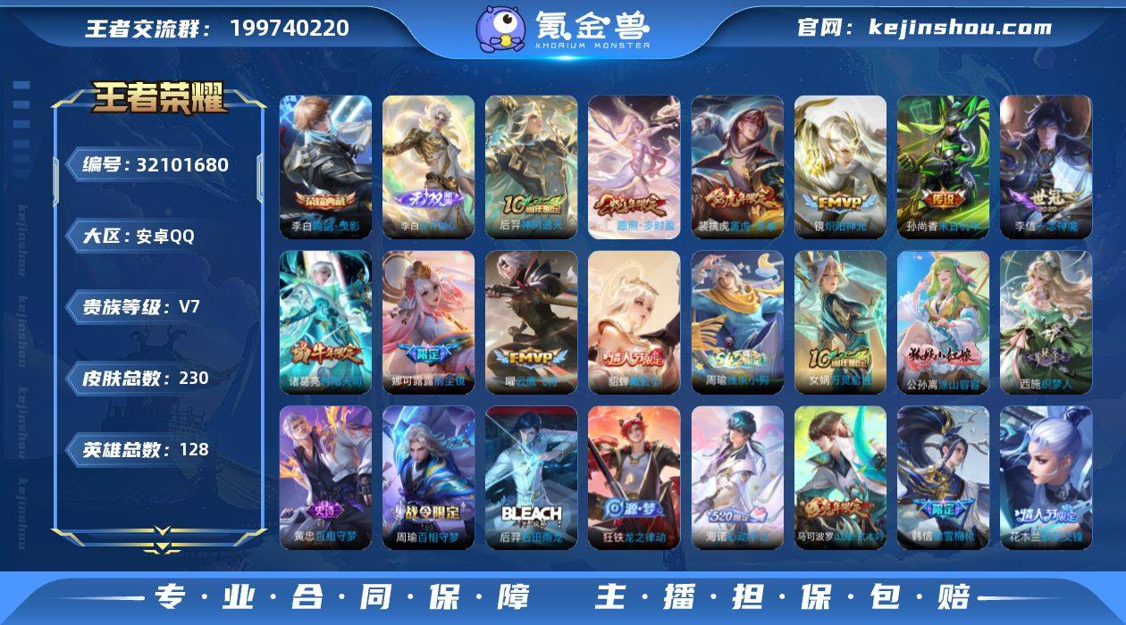实名: 可修改 贵族等级: V7 英雄数: 128 皮肤数: 230 荣耀水晶: 鸣剑·曳影 无双皮: 碎月剑心 传说皮: 云鹰飞将,炽阳神光,一念神魔,末日机甲-孙尚香,貂蝉曦玄引,神树通天 限定皮: 时雨天司,如梦令-后羿,默契交锋-花木兰,傲雪梅枪,寅虎·赤拳,前尘镜,五谷丰年,山海·玄木吟,愿照·岁时盈