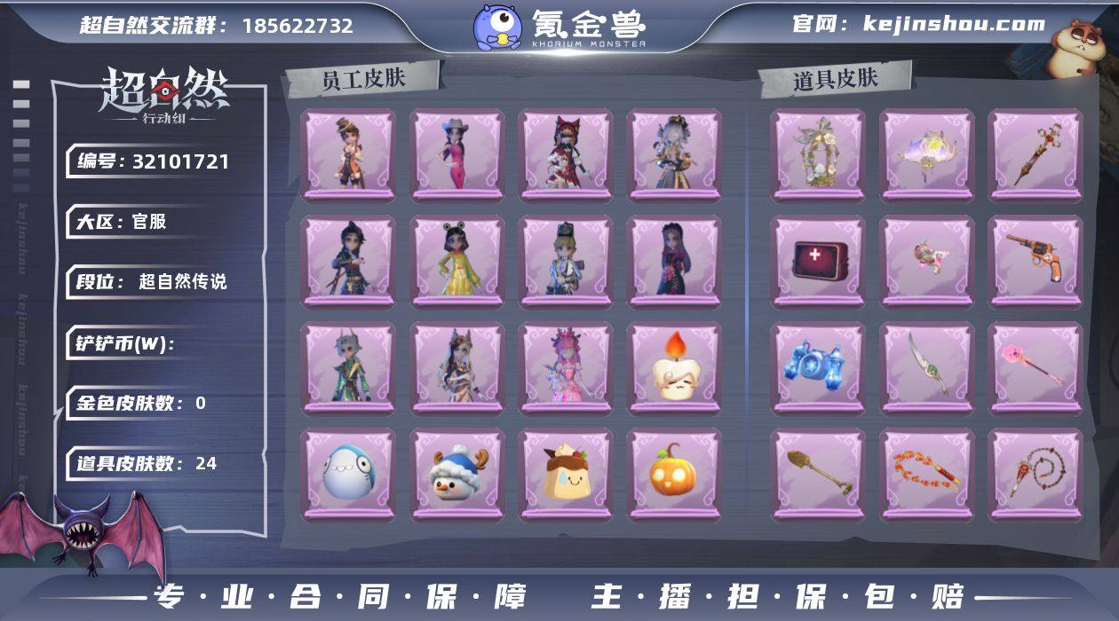 红色皮肤数量:0 金色皮肤数量:0 紫色皮肤数量:12 道具皮肤数量:24 卖家说:白泽莉莉三紫25道具皮,楚子航