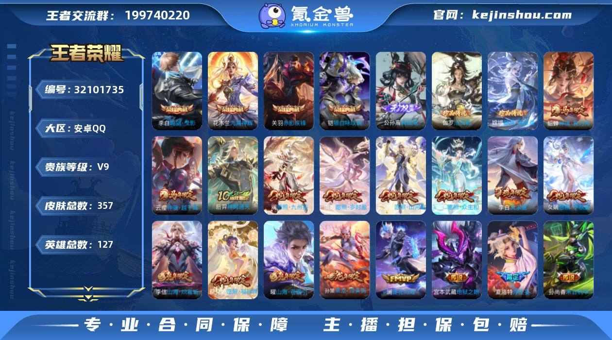 贵族等级:V9 典藏皮肤数:4 珍品无双皮肤数:0 无双皮肤数:1 珍品传说皮肤数:2 传说皮肤数:39 史诗皮肤数:102 皮肤数:357 英雄数:127 段位:荣耀王者