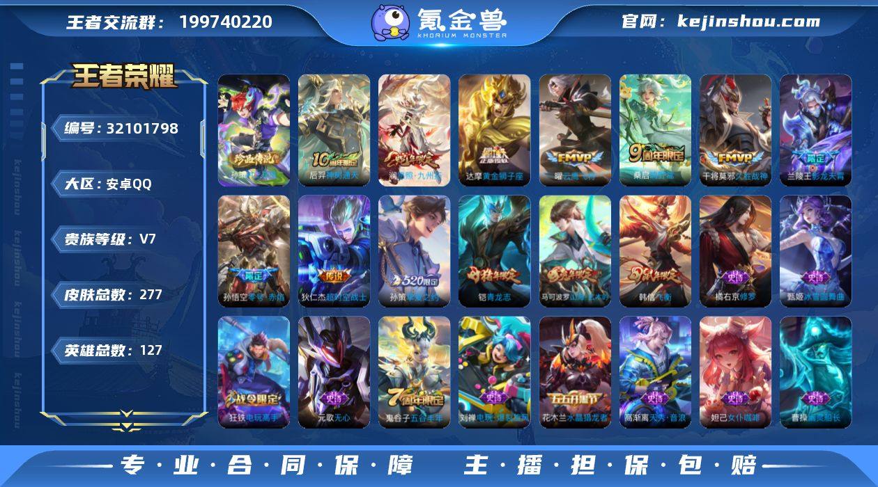 V7 1典藏 1珍品 10传说 277皮肤 127英雄 【1水晶】【1珍品传说】孙策-时之奇旅【10传说】孙策-挚爱之约,达摩-黄金狮子座,狄仁杰-超时空战士,干将莫邪-久胜战神,孙悟空-零号·赤焰,兰陵王-影龙天霄,曜-云鹰飞将,桑启-鸣野蒿,澜-愿照·九州拓,后羿-神树通天【55史诗】元歌-无心,鬼谷子-五谷丰年,赵云-未来纪元,张良-千筹问战,狂铁-电玩高手,高渐离-天秀·音浪,明世隐-吟游魔法,阿轲-节奏热浪,安琪拉-心灵骇客,白起-星夜王子,百里守约-特工魅影,百里玄策-原初追逐者,曹操-幽灵船长,程咬金-功夫厨神,妲己-女仆咖啡,妲己-魅力维加斯,狄仁杰-魔术师,狄仁杰-鹰眼统帅,伽罗-箭羽风息,宫本武藏-鬼剑武藏,韩信-飞衡,花木兰-水晶猎龙者,橘右京-修罗,铠-青龙志,兰陵王-暗隐猎兽者,李白-千年之狐,李元芳-逐浪之夏,廉颇-地狱岩魂,刘邦-德古拉伯爵,吕布-圣诞狂欢,吕布-末日机甲,墨子-金属风暴,上官婉儿-梁祝,孙策-猫狗日记,孙尚香-水果甜心,孙尚香-蔷薇恋人,夏侯惇-乘风破浪,雅典娜-黎明之约,杨戬-天秀·启明,嬴政-摇滚巨星,嬴政-暗夜贵公子,嬴政-优雅恋人,张飞-乱世虎臣,赵云-皇家上将,甄姬-冰雪圆舞曲,诸葛亮-黄金分割率,庄周-高山流水,百里守约-真我赫兹,戈娅-驭风魔法,刘禅-电玩·爆裂旋风,马可波罗-山海·玄木吟,镜-青焰无极,蒙犽-百解令,蒙恬-荣光圣徽,弈星-万物之道