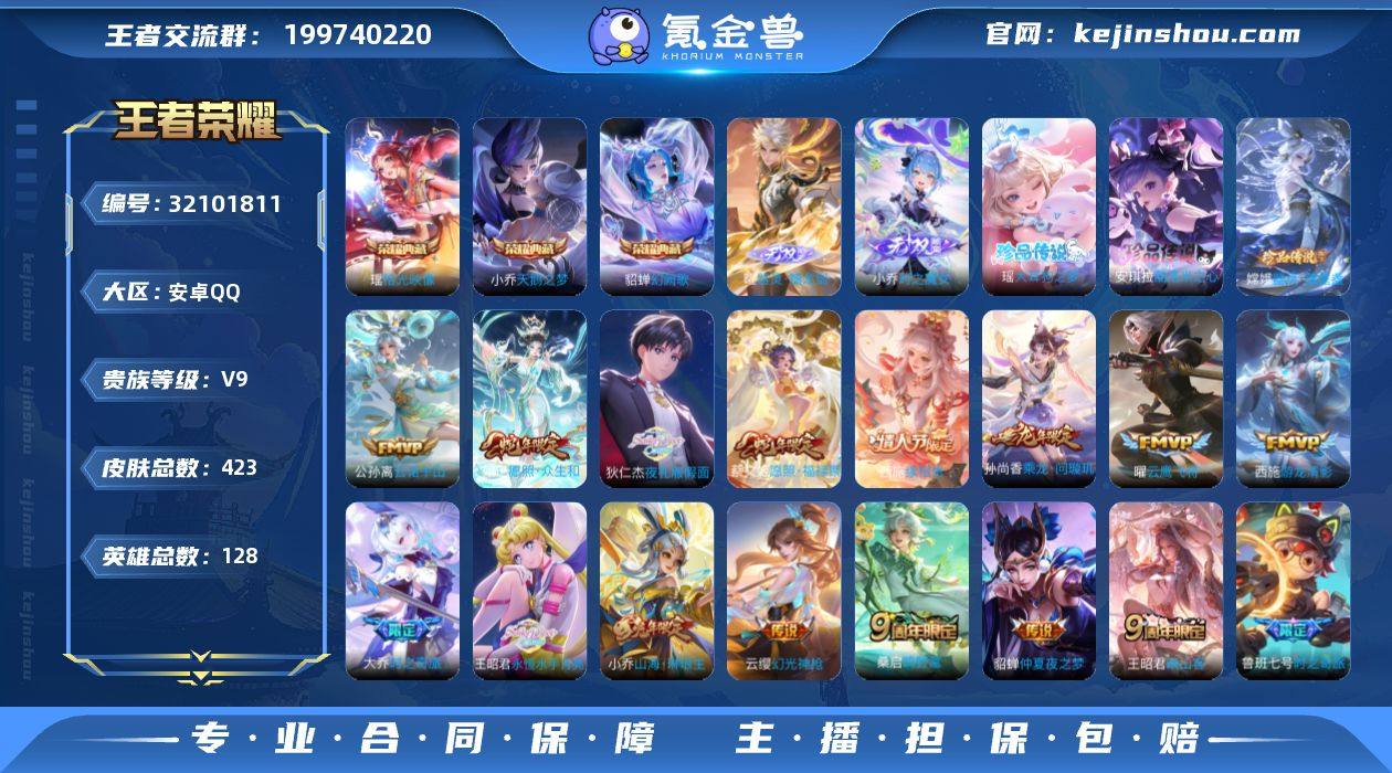 【王者荣耀】珍品无双0 典藏3 无双4 珍品传说4 传说33 史诗132 英雄128 皮肤423 贵族9级 荣耀典藏:天鹅之梦|幻阙歌|拾光映像__无双皮肤:时之魔女|真我赫兹|雪境奇遇|器灵·螭龙剑__珍品传说:孙策-时之奇旅|器灵·落星盏|大耳狗之梦|酷洛米之心__传说皮肤:鸣野蒿|音你闪耀|挚爱花嫁|花朝如约|启明星使|仲夏夜之梦|黄金白羊座|猫影幻舞|云鹰飞将|游龙清影|乞巧织情|淬星耀世|瑶-时之祈愿|电玩·雷克斯|大乔-时之奇旅|鲁班七号-时之奇旅|貂蝉-曦玄引|小乔-音你心动|夜礼服假面|永恒水手月亮|周瑜-音你心动|乘龙·问璇玑|山海·琳琅生|朵莉亚-心动手记|至美·化雀舞|映山客|牧神诗旅|玄雷天君|幻光神枪|愿照·众生和|愿照·福禄聚|续相思|云诺千山__稀有限定:蔷薇恋人|奇迹圣诞|蜜橘之夏|龙胆|白鹤梁神女|女儿国国王|山海·碧波行|神器·万象笔|时之彼端|狮舞东方|拒霜思|百解令|嫦娥-如梦令|妲己-时之奇旅|大漠名商|地狱燃心|电玩高手|繁星吟游|高山流水|古海寻踪|海滩派对|海盐诗旅|幻夜卜梦|皇家上将|剑破天穹|江河有灵|金庭之子|梦圆繁星|魔法小厨娘|魔术师|匿光侦查者|女武神|奇幻香踪|千军破阵|擒涛扼浪|青焰无极|驱傩正仪|燃音魔法|沙漠行僧|探海日志|天狼狩猎者|天穹祈灯|阿古朵-顽趣|妄想食味|无心|五谷丰年|午后时光|纤云弄巧|星界游侠|阴阳师|银河之约|游园惊梦|驭风魔法|遇见飞天|逐梦之音|暗夜贵公子|暗夜猫娘|暗隐猎兽者|白蛇|缤纷独角兽|冰冠公主|冰雪圆舞曲|乘风破浪|乘龙·聚宝船|乘龙·忆丹青|大乔-猫狗日记|德古拉伯爵|地狱岩魂|电玩·爆裂旋风|电玩·兔顽号|浮梦罗烟|伽罗-琥珀纪元|功夫厨神|鬼剑武藏|唤灵魅影|箭羽风息|节奏热浪|金属风暴|乐园奇幻夜|李元芳-蔬乡物语|吕布-末日机甲|魅力维加斯|魅语|女仆咖啡|偶像歌手|青蛇|赏金猎手|上官婉儿-群星魔术团|绅士熊喵|圣诞狂欢|圣诞恋歌|诗语江南|鲁班七号-蔬乡...