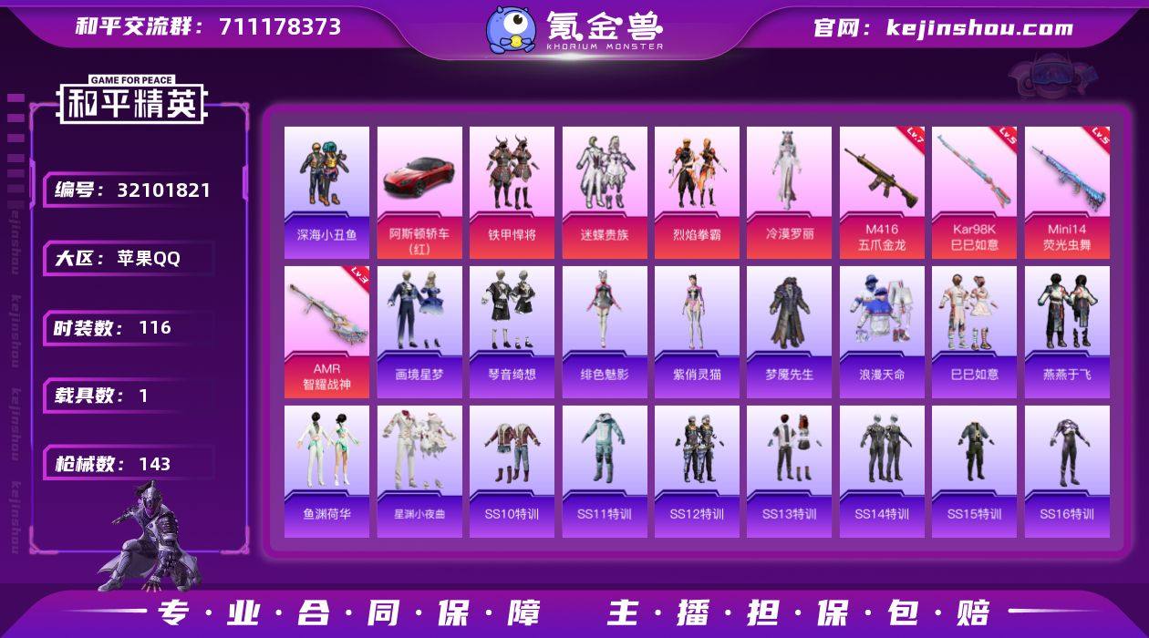 J2493 【性价比小号】5粉 5特 1载 深海小丑鱼 浪漫天命 千仞雪 冷漠罗丽 迷蝶贵族 满级枪*2 苹果 手Q-5粉装-5特效枪-1载具-2粉色飞行器-46725热力值-13王牌印记-116套装-143枪皮 【热门品类】:套装-浪漫天命,套装-深海小丑鱼,旭日初心兜帽大衣 【粉色套装】:粉装-铁甲悍将,粉装-迷蝶贵族,粉装-烈焰拳霸,角色-冷漠罗丽,角色-千仞雪 【粉色枪皮等级】:M416-五爪金龙(七级),Kar98K-巳巳如意(五级),Mini14-荧光虫舞(五级),Mk14-福马献瑞(一级),AMR-智耀战神(三级) 【粉色载具】:阿斯顿马丁DBS(红) 【粉色枪皮】:M416-五爪金龙,Kar98K-巳巳如意,Mini14-荧光虫舞,Mk14-福马献瑞,AMR-智耀战神 【粉色飞行器】:炫彩糖果飞行器,荧光虫舞飞行器 【粉色降落伞】:荧光虫舞降落伞,绮梦青鸾降落伞,暗夜玫瑰降落伞,暗夜鎏金降落伞,未来歌姬降落伞,幻彩电音降落伞,异瞳寒姬降落伞,炫彩糖果降落伞,千仞雪降落伞 【稀有套装】:套装-巳巳如意,套装-雪国风尚,套装-炫彩糖果,套装-燕燕于飞,套装-鱼渊荷华,套装-星渊小夜曲,角色-绯色魅影,角色-紫俏灵猫,套装-画境星梦,套装-琴音绮想,套装-雨过天青,套装-红釉青花,角色-唐三,角色-朱竹清 【稀有枪皮】:AKM-夜灯,AKM-彩虹符号,AKM-灼热熔岩,AKM-破晓战魂,AKM-萌趣颜团子,M16A4-红色方程式,SCAR-L-夜灯,SCAR-L-炫彩节奏,M416-夜灯,M416-糯团青竹,GROZA-彩虹符号,GROZA-懵萌河马,GROZA-梨园星光,GROZA-治愈之星,AUG-耀粉歌者,AUG-青春冒险家,QBZ-彩虹符号,QBZ-赛罗,M762-天降萌叽,M762-烈焰拳霸,M762-牛气冲天,M762-绯红前夜,M762-镭射皇者,Mk47-洛神天依,Mk47-青春冒险家,G36C-懵萌河马,G36C-星穹咏叹调,AC-VAL-六号稻草人,蜜獾-天降萌叽,ACE32-画境星梦,UMP45-涂山之恋,UMP45-生命誓言,Vector-夜灯,Vect...