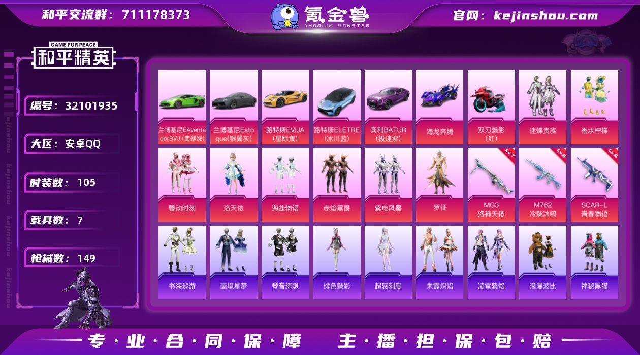 【特价出售/店主推荐】安卓 手Q-9粉装-5特效枪-7载具-1粉色飞行器-55277热力值-6王牌印记-105套装-149枪皮 【热门品类】:套装-浪漫波比 【粉色套装】:粉装-迷蝶贵族,粉装-香水柠檬,粉装-馨动时刻,角色-洛天依,粉装-海盐物语,粉装-赤焰黑爵,粉装-紫电风暴,角色-罗征,角色-霁蓝缠春 【粉色枪皮等级】:SCAR-L-青春物语(四级),M762-冷魅冰骑(六级),ACE32-萌骑漫游(四级),Mk14-福马献瑞(五级),MG3-洛神天依(七级) 【粉色载具】:兰博基尼Aventador SVJ(翡翠绿),兰博基尼Estoque(银翼灰),路特斯EVIJA(星际黄),路特斯ELETRE(冰川蓝),宾利BATUR(极速紫),海龙奔腾,双人摩托-双刃魅影(红) 【粉色枪皮】:SCAR-L-青春物语,M762-冷魅冰骑,ACE32-萌骑漫游,Mk14-福马献瑞,MG3-洛神天依 【粉色飞行器】:青春物语飞行器 【粉色降落伞】:春暖花开降落伞,星之彼岸降落伞,洛神天依降落伞,暗星紫秘降落伞,焦糖拿铁降落伞,碧影闪光降落伞,恐龙拽拽降落伞,筑梦精灵降落伞,暖熊萌萌降落伞,萌物绒绒降落伞,宁雨蝶降落伞,荧海星豚降落伞,无垠阁降落伞,炫彩糖果降落伞,霁蓝缠春降落伞,罪夜之冕降落伞 【稀有套装】:角色-超感刻度,套装-雪国风尚,套装-马上有钱,套装-云朵鹅,套装-雪绒豹,套装-蜜露汐语,套装-朱霞炽焰,套装-凌霄紫焰,角色-绯色魅影,套装-书海巡游,套装-画境星梦,套装-琴音绮想,角色-霜刃之御,角色-月烬之祷,套装-雨过天青,套装-红釉青花 【稀有枪皮】:AKM-彩虹符号,AKM-星之彼岸,AKM-灼热熔岩,AKM-百万伏特,AKM-破晓战魂,M16A4-幻世战舞者,M16A4-快乐主宰,M16A4-甜心亚梦,SCAR-L-炫彩节奏,SCAR-L-红色方程式,M416-月影鸳鸯,M416-神秘黑猫,M416-紫翼圣骑,M416-蓝色火焰,GROZA-异彩先驱,GROZA-田园牧歌,GROZA-紫翼圣骑,GROZA-荧海星豚...