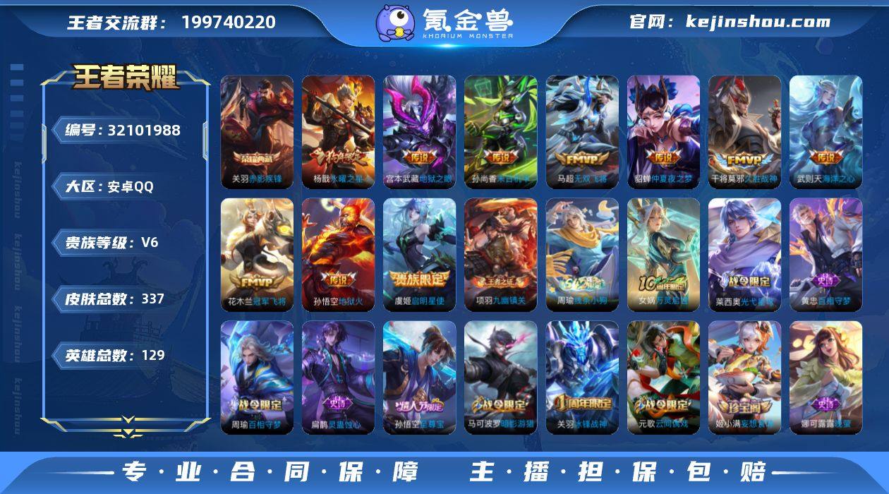 实名: 可修改 贵族等级: V6 英雄数: 129 皮肤数: 337 荣耀水晶: 武则天,赤影疾锋 传说皮: 冠军飞将,久胜战神,末日机甲-孙尚香,地狱火,仲夏夜之梦,海洋之心,地狱之眼,无双飞将,启明星使 限定皮: 冰锋战神,遇见飞天,李小龙,游园惊梦,梁祝,魔法小厨娘,永曜之星,至尊宝,霸王别姬-虞姬,五谷丰年