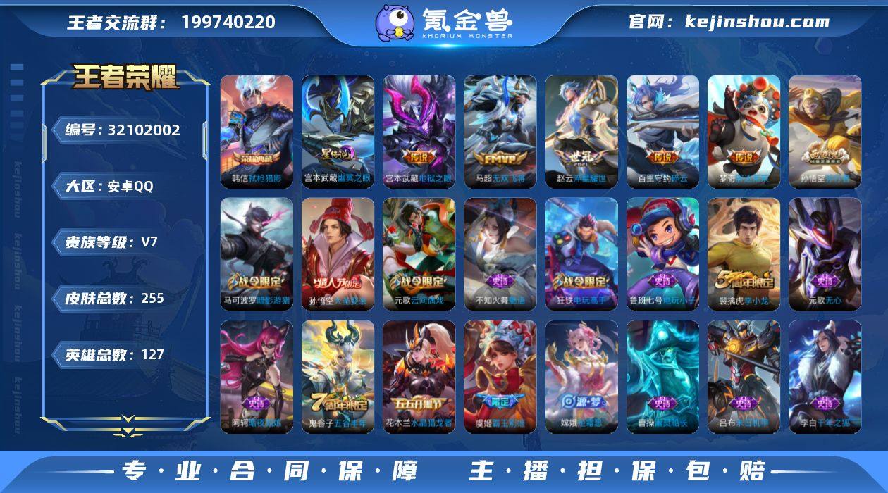 V7 1典藏 5传说 1星元 255皮肤 127英雄 【1水晶】韩信-弑枪猎影【5传说】百里守约-碎云,马超-无双飞将,宫本武藏-地狱之眼,梦奇-胖达荣荣,赵云-淬星耀世【1星元】宫本武藏-幽冥之眼【57史诗】元歌-无心,鬼谷子-五谷丰年,赵云-未来纪元,钟无艳-超时空战士,狂铁-电玩高手,艾琳-奇遇舞章,明世隐-吟游魔法,阿轲-暗夜猫娘,安琪拉-心灵骇客,白起-星夜王子,百里守约-特工魅影,百里玄策-原初追逐者,不知火舞-魅语,曹操-幽灵船长,蔡文姬-繁星吟游,嫦娥-拒霜思,程咬金-功夫厨神,妲己-魅力维加斯,狄仁杰-魔术师,狄仁杰-鹰眼统帅,干将莫邪-真爱魔法,宫本武藏-鬼剑武藏,花木兰-水晶猎龙者,黄忠-火炮绅士,老夫子-航海奇遇记,李白-千年之狐,李元芳-逐浪之夏,廉颇-地狱岩魂,鲁班七号-电玩小子,鲁班七号-狮舞东方,吕布-圣诞狂欢,吕布-末日机甲,马可波罗-暗影游猎,蒙犽-狂想玩偶喵,米莱狄-胡桃异想国,上官婉儿-梁祝,裴擒虎-李小龙,孙策-猫狗日记,孙尚香-水果甜心,孙尚香-蔷薇恋人,孙悟空-大圣娶亲,孙悟空-孙行者,王昭君-偶像歌手,夏侯惇-乘风破浪,雅典娜-冰冠公主,雅典娜-黎明之约,嬴政-暗夜贵公子,虞姬-霸王别姬,元歌-云间偶戏,云中君-纤云弄巧,赵云-皇家上将,诸葛亮-黄金分割率,庄周-高山流水,夏侯惇-匿光决锋者,梦奇-顽趣,蒙犽-百解令,蒙恬-荣光圣徽