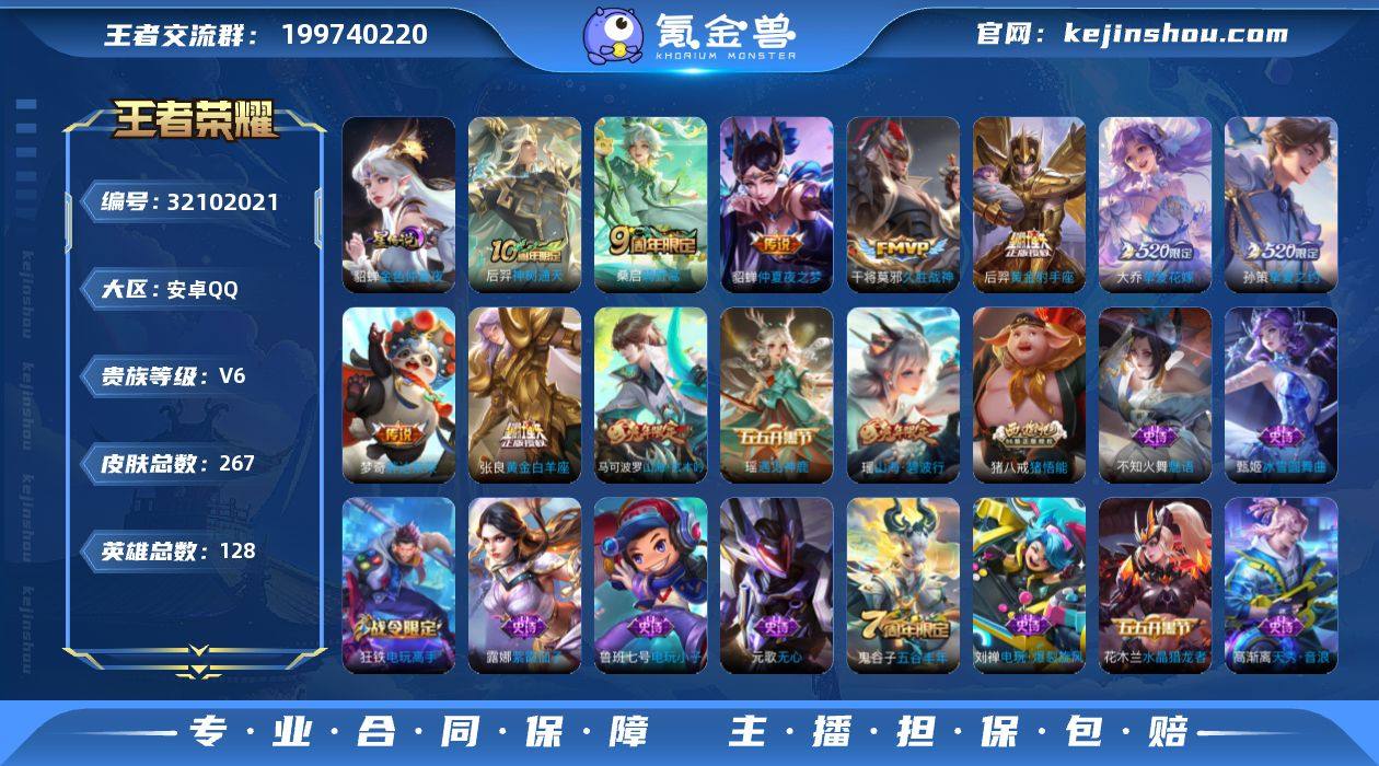 V6 9传说 1星元 267皮肤 128英雄 【9传说】大乔-挚爱花嫁,孙策-挚爱之约,貂蝉-仲夏夜之梦,干将莫邪-久胜战神,后羿-黄金射手座,梦奇-胖达荣荣,张良-黄金白羊座,桑启-鸣野蒿,后羿-神树通天【1星元】貂蝉-金色仲夏夜之梦【52史诗】元歌-无心,鬼谷子-五谷丰年,赵云-未来纪元,狂铁-电玩高手,高渐离-天秀·音浪,明世隐-吟游魔法,阿轲-节奏热浪,安琪拉-心灵骇客,百里玄策-原初追逐者,不知火舞-魅语,蔡文姬-舞动绿茵,曹操-幽灵船长,嫦娥-拒霜思,程咬金-功夫厨神,妲己-女仆咖啡,妲己-魅力维加斯,大乔-猫狗日记,狄仁杰-魔术师,狄仁杰-鹰眼统帅,伽罗-箭羽风息,宫本武藏-鬼剑武藏,花木兰-水晶猎龙者,黄忠-火炮绅士,李白-千年之狐,刘邦-德古拉伯爵,露娜-紫霞仙子,鲁班七号-电玩小子,吕布-末日机甲,墨子-金属风暴,孙策-猫狗日记,孙尚香-水果甜心,孙尚香-蔷薇恋人,王昭君-偶像歌手,小乔-缤纷独角兽,雅典娜-黎明之约,亚瑟-心灵战警,嬴政-摇滚巨星,瑶-遇见神鹿,云中君-纤云弄巧,赵云-皇家上将,甄姬-冰雪圆舞曲,甄姬-游园惊梦,猪八戒-猪悟能,庄周-高山流水,瑶-山海·碧波行,暃-星界游侠,梦奇-顽趣,刘禅-电玩·爆裂旋风,鲁班七号-蔬乡物语,马可波罗-山海·玄木吟,蒙犽-百解令,蒙恬-荣光圣徽