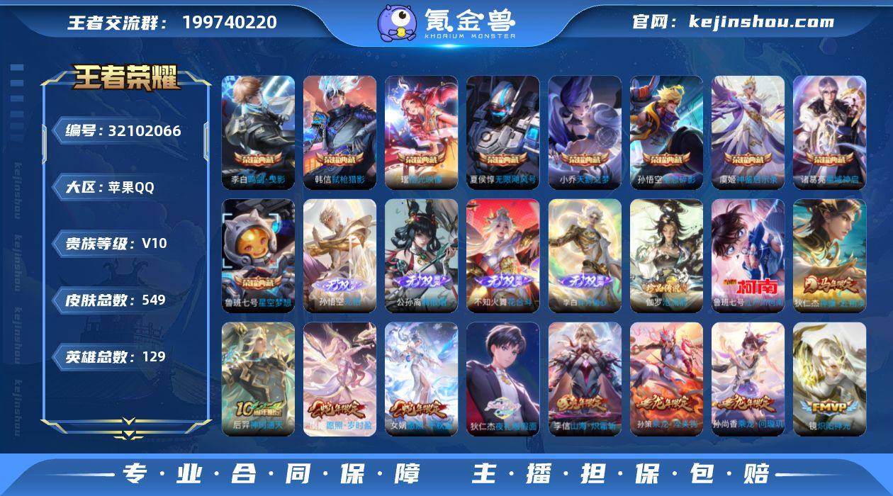 【王者荣耀】珍品无双0 典藏10 无双4 珍品传说2 传说68 史诗181 英雄129 皮肤549 贵族10级 荣耀典藏:无限飓风号|全息碎影|天鹅之梦|武则天|神鉴启示录|鸣剑·曳影|弑枪猎影|星空梦想|星域神启|拾光映像__无双皮肤:碎月剑心|离恨烟|花合斗|无相__珍品传说:江户川柯南|沧流箭__传说皮肤:鸣野蒿|音你闪耀|无尽星芒|无双飞将|孙尚香-异界灵契|绛天战甲|炽阳神光|启明星使|胖达荣荣|地狱之眼|地狱火|海洋之心|孙策-末日机甲|仲夏夜之梦|云霓雀翎|久胜战神|黄金狮子座|狄仁杰-超时空战士|黄金射手座|黄金白羊座|刘备-时之恋人|一念神魔|云鹰飞将|冠军飞将|飞鸢探春|游龙清影|乞巧织情|淬星耀世|炽翼辉光|鹤羽星尊|记忆之芯|孙尚香-末日机甲|齐天大圣|大乔-时之奇旅|黄金天蝎座|惊梅引|铠-琥珀纪元|零号·赤焰|鲁班七号-时之奇旅|马超-琥珀纪元|怒海麟威|霜月吟|碎云|妄想奇谈|小动物乐团|小乔-音你心动|夜礼服假面|寅虎·瑞焰|影龙天霄|永恒水手月亮|遇见神鼓|战鼓燎原|逐花归海|乘龙·淬吴钩|乘龙·铭钟鼎|乘龙·问璇玑|云缨-鹤归松栖|觅芳踪|山海·炽霜斩|至美·化雀舞|灼幽烈阳|冥王哈迪斯|牧神诗旅|愿照·岁时盈|愿照·千秋盛|神树通天|神骥·赴朔漠__稀有限定:御风骁将|白晶晶|至尊宝|引擎之心|岱宗|幽恒|飞衡|蔷薇恋人|虎魄|乒乒小将|孙行者|李小龙|山海·碧波行|山海·玄木吟|神器·万象笔|拒霜思|暗影游猎|百解令|百里守约-真我赫兹|百木心枪|冰霜恋舞曲|嫦娥-如梦令|超元猎域|大漠名商|地狱燃心|繁星吟游|高山流水|古海寻踪|海滩派对|海盐诗旅|航海奇遇记|后羿-如梦令|胡桃异想国|幻夜卜梦|皇家上将|辉光之辰|混沌棋|火炮绅士|剑破天穹|江河有灵|降魔|金庭之子|镜-真我赫兹|决胜骁骑|狂想玩偶喵|黎明之约|美猴王|魔法小厨娘|魔术师|匿光破解者|匿光侦查者|女武神|千军破阵|擒涛扼浪|青焰无极|驱傩正仪|燃音魔法|荣光圣徽|沙漠...