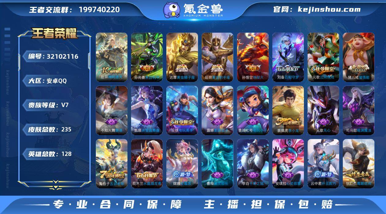 V7 5传说 235皮肤 128英雄 【5传说】达摩-黄金狮子座,后羿-黄金射手座,孙尚香-末日机甲,孙悟空-地狱火,后羿-神树通天【48史诗】元歌-无心,鬼谷子-五谷丰年,狂铁-电玩高手,安琪拉-心灵骇客,白起-星夜王子,百里守约-特工魅影,百里玄策-原初追逐者,不知火舞-魅语,曹操-幽灵船长,嫦娥-拒霜思,妲己-魅力维加斯,狄仁杰-魔术师,狄仁杰-鹰眼统帅,伽罗-箭羽风息,干将莫邪-真爱魔法,宫本武藏-鬼剑武藏,花木兰-水晶猎龙者,兰陵王-暗隐猎兽者,李白-千年之狐,李元芳-逐浪之夏,李元芳-银河之约,刘邦-德古拉伯爵,刘禅-绅士熊喵,露娜-紫霞仙子,鲁班七号-电玩小子,吕布-圣诞狂欢,米莱狄-胡桃异想国,墨子-金属风暴,上官婉儿-梁祝,裴擒虎-李小龙,司马懿-暗渊魔法,孙尚香-水果甜心,孙尚香-蔷薇恋人,雅典娜-黎明之约,嬴政-白昼王子,元歌-云间偶戏,云中君-纤云弄巧,赵云-皇家上将,甄姬-冰雪圆舞曲,甄姬-游园惊梦,诸葛亮-黄金分割率,猪八戒-猪悟能,庄周-高山流水,刘备-百相守梦,梦奇-顽趣,镜-真我赫兹,蒙恬-荣光圣徽,弈星-万物之道