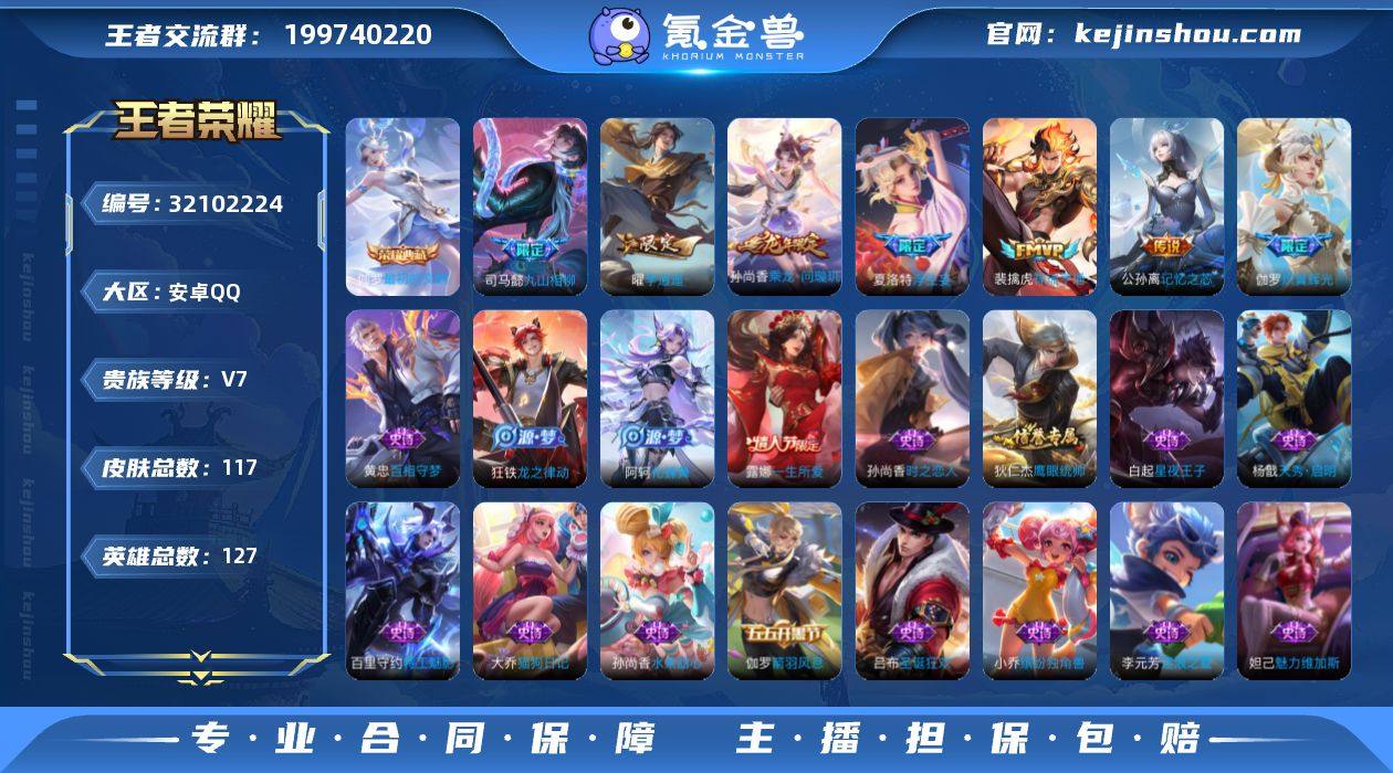 响·神罪·神骥逐星野·诡秘之主·李逍遥 ·九山相柳·祥瑞亨通·乘龙问璇玑·记忆之芯·浮生妄·万灵伏威·炽翼辉光·可二次】w18025-安卓Q-127英雄-117皮肤-2王者印记-220铭文-贵族积分4w【贵族7】【1典藏·1无双·13传说·20按键】【因赛季更新游戏段付以上号为准!】 【英雄全皮】:孙权全皮,敖隐全皮,影全皮 【荣耀典藏】:伽罗最初的交响 【无双皮肤】:铠神罪 【传说皮肤】:马超神骥逐星野,后羿神树通天,曹操万灵伏威,干将莫邪千山共赴,元歌诡秘之主,大司命死亡执政官,司马懿九山相柳,裴擒虎祥瑞亨通,孙尚香乘龙问璇玑,公孙离记忆之芯,夏洛特浮生妄,伽罗炽翼辉光,曜李逍遥 【限定皮肤】:虞姬夏日便利店,狄仁杰阴阳师,赵云皇家上将,周瑜赤莲之焰,夏侯惇朔风刀,典韦蓝屏警告,狄仁杰魔术师,狄仁杰万华元夜,项羽海滩派对,程咬金演武夺筹,露娜一生所爱,兰陵王驯魔猎人,牛魔御旌,李元芳云中旅人,钟馗驱傩正仪,女娲朔望之晖,鬼谷子原初探秘者,明世隐疑决卦,裴擒虎擒涛扼浪,伽罗炽翼辉光,盾山御銮,曜李逍遥 ,桑启海盐诗旅,夏洛特浮生妄,艾琳流音漫舞,鬼谷子天穹祈灯,孙尚香乘龙问璇玑,刘邦剑破天穹 【年限皮肤】:孙尚香乘龙问璇玑 【赛季限定】:牛魔御旌,盾山御銮,夏侯惇朔风刀,明世隐疑决卦,鬼谷子原初探秘者,狄仁杰万华元夜,程咬金演武夺筹,钟馗驱傩正仪,李元芳云中旅人,桑启海盐诗旅,裴擒虎擒涛扼浪,鬼谷子天穹祈灯,刘邦剑破天穹,甄姬逆浪荇歌,亚瑟荣光之誓 【战令限定】:典韦蓝屏警告,女娲朔望之晖,兰陵王驯魔猎人,周瑜赤莲之焰,艾琳流音漫舞,虞姬夏日便利店,兰陵王傩神司,莱西奥光弋星穹,明世隐往忆晖光,周瑜线条小狗 【史诗皮肤】:周瑜线条小狗,少司缘巫礼祀神,女娲万灵启世,兰陵王傩神司,莱西奥光弋星穹,公孙离涂山容容,黄忠百相守梦,狂铁龙...