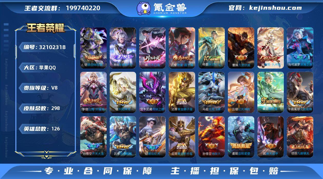 实名: 可修改 贵族等级: V8 英雄数: 126 皮肤数: 298 荣耀水晶: 银白咏叹调 无双皮: 韩信群星魔术团 珍品传说: 朽木白哉 传说皮: 黄金狮子座,黄金射手座,绛天战甲,久胜战神,炽阳神光,地狱火,地狱之眼,无双飞将,山海·炽霜斩,琥珀纪元铠,幻光神枪,万灵伏威,纵目迁山,神骥·越千峰 限定皮: 引擎之心,飞衡,美猴王,青龙志,瑞麟志,至尊宝,孙行者,深海之息,五谷丰年,降魔,怒海麟威,齐天大圣,鸣野蒿,愿照·九州拓