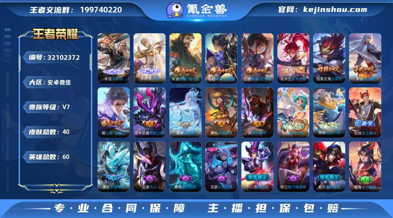 极品小号!打野号 安卓WX-V7-最强王者段位-60英雄-40皮肤-2无双-11传说-17限定-7按键 【英雄全皮】:孙权全皮,敖隐全皮 【无双皮肤】:李信问心剑,孙悟空无相 【传说皮肤】:云缨神骥越千峰,关羽神骥镇沧海,马超神骥逐星野,花木兰异界灵契,典韦战鼓燎原,露娜霜月吟,曜山海苍雷引,铠绛天战甲,百里玄策白虎志,李白凤求凰,宫本武藏地狱之眼 【限定皮肤】:赵云皇家上将,元歌无心,狄仁杰魔术师,项羽海滩派对,百里玄策白虎志,曜山海苍雷引,盘古冰霜神祇 【年限皮肤】:李白凤求凰,百里玄策白虎志,曜山海苍雷引 【赛季限定】:亚瑟荣光之誓 【战令限定】:周瑜线条小狗,小乔线条小狗 【史诗皮肤】:周瑜线条小狗,小乔线条小狗,狂铁龙之律动,盘古冰霜神祇,元歌无心,亚瑟心灵战警,曹操幽灵船长,妲己魅力维加斯,狄仁杰魔术师,赵云皇家上将 【其他皮肤】:妲己线条小狗,虞姬溯影追猎,蚩奼极光幻客,孙权径山谋武,亚瑟荣光之誓,后羿阿尔法小队,花木兰兔女郎,亚瑟死亡骑士,安琪拉玩偶对对碰,赵云忍炎影,韩信街头霸王,项羽海滩派对,桑启画中游,暃碧珀绯影,云缨赤焰之缨,明世隐占星师 【营地ID】:1596136336