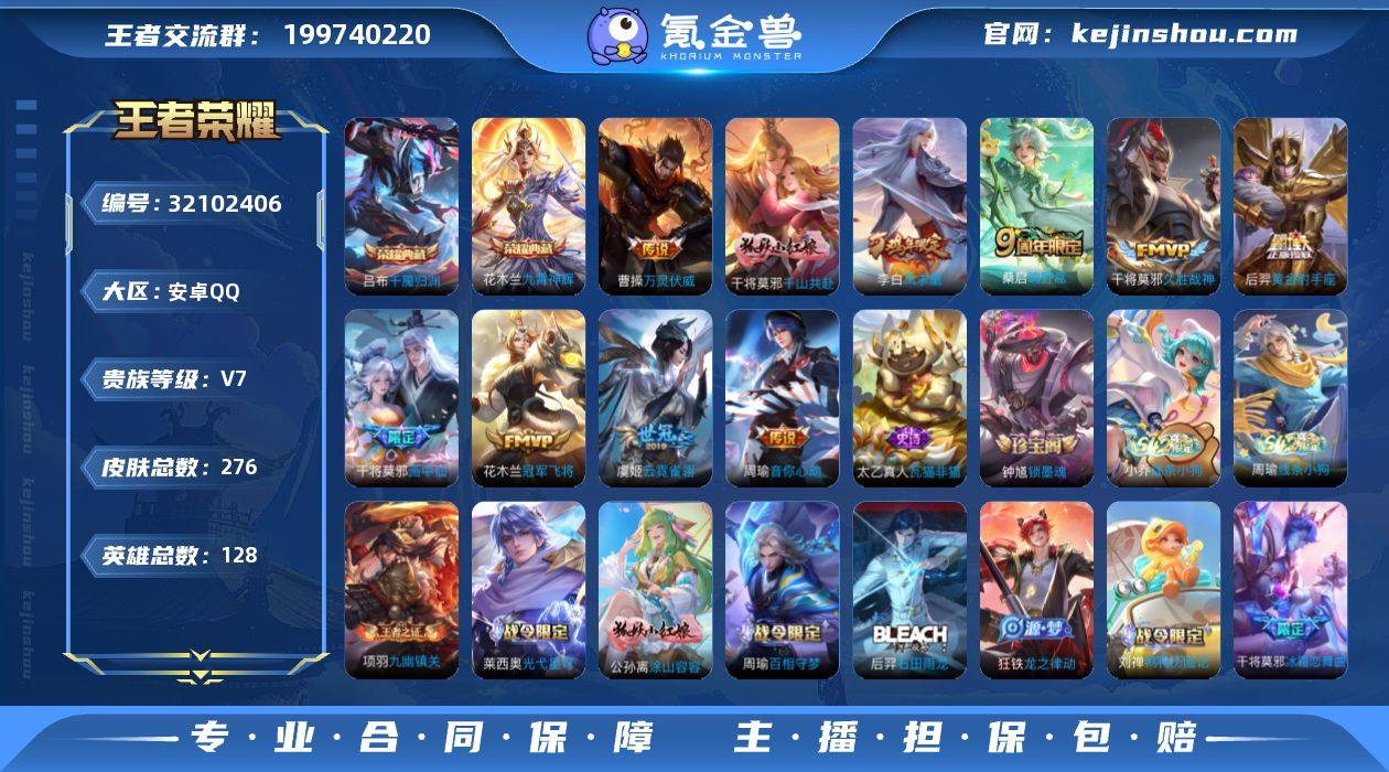贵族等级:V7 典藏皮肤数:2 珍品无双皮肤数:0 无双皮肤数:0 珍品传说皮肤数:0 传说皮肤数:10 史诗皮肤数:87 皮肤数:276 英雄数:128 段位:绝世王者 卖家说:干将全皮 喜欢的来 星币还有4800