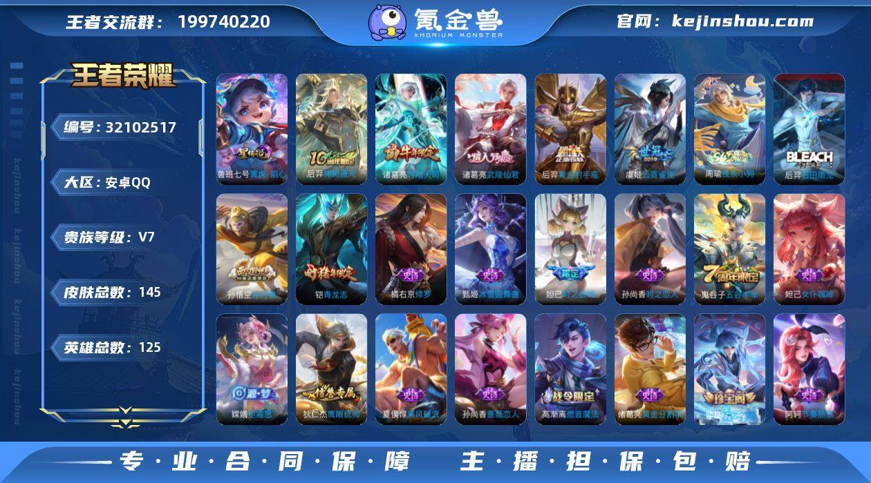 W14939,,可立即换绑无需挂单养号,钱包不能注销,铭文满级,,,传说5,,,星传说1,,按键7,,,天幕2,,夺宝194,,安卓Q-V7-至尊星耀II段位-125英雄-145皮肤-5传说-30史诗 【传说皮肤】:后羿神树通天,诸葛亮时雨天司,虞姬云霓雀翎,后羿黄金射手座,诸葛亮武陵仙君 【限定皮肤】:狄仁杰阴阳师,赵云皇家上将,妲己时之彼端,孙尚香蔷薇恋人,狄仁杰魔术师,狄仁杰万华元夜,达摩沙漠行僧,项羽海滩派对,程咬金演武夺筹,兰陵王金庭之子,孙悟空孙行者,后羿圣弓游侠,李元芳云中旅人,钟馗驱傩正仪,干将莫邪真爱魔法,鬼谷子五谷丰年,诸葛亮武陵仙君,诸葛亮时雨天司,铠青龙志,苏烈千军破阵,沈梦溪大漠名商,裴擒虎擒涛扼浪,嫦娥拒霜思,鲁班大师探海日志,桑启海盐诗旅,张良古海寻踪,蒙犽百解令,高渐离燃音魔法,妲己灵卜魔法,鬼谷子天穹祈灯,刘邦剑破天穹,刘备异域游侠 【年限皮肤】:铠青龙志,诸葛亮时雨天司 【赛季限定】:狄仁杰万华元夜,程咬金演武夺筹,钟馗驱傩正仪,苏烈千军破阵,达摩沙漠行僧,兰陵王金庭之子,沈梦溪大漠名商,李元芳云中旅人,桑启海盐诗旅,裴擒虎擒涛扼浪,鲁班大师探海日志,张良古海寻踪,鬼谷子天穹祈灯,刘邦剑破天穹,钟馗虚灵犬护,甄姬逆浪荇歌,亚瑟荣光之誓 【战令限定】:干将莫邪真爱魔法,后羿圣弓游侠,高渐离燃音魔法,妲己灵卜魔法,周瑜线条小狗 【史诗皮肤】:周瑜线条小狗,后羿石田雨龙,弈星万物之道,高渐离燃音魔法,妲己灵卜魔法,蒙犽百解令,鬼谷子五谷丰年,嫦娥拒霜思,孙悟空孙行者,干将莫邪真爱魔法,孙尚香时之恋人,橘右京修罗,妲己时之彼端,狄仁杰鹰眼统帅,伽罗箭羽风息,铠青龙志,阿轲节奏热浪,李元芳逐浪之夏,诸葛亮黄金分割率,兰陵王暗隐猎兽者,夏侯惇乘风破浪,刘邦德古拉伯爵,妲己女仆咖啡,妲己魅力...