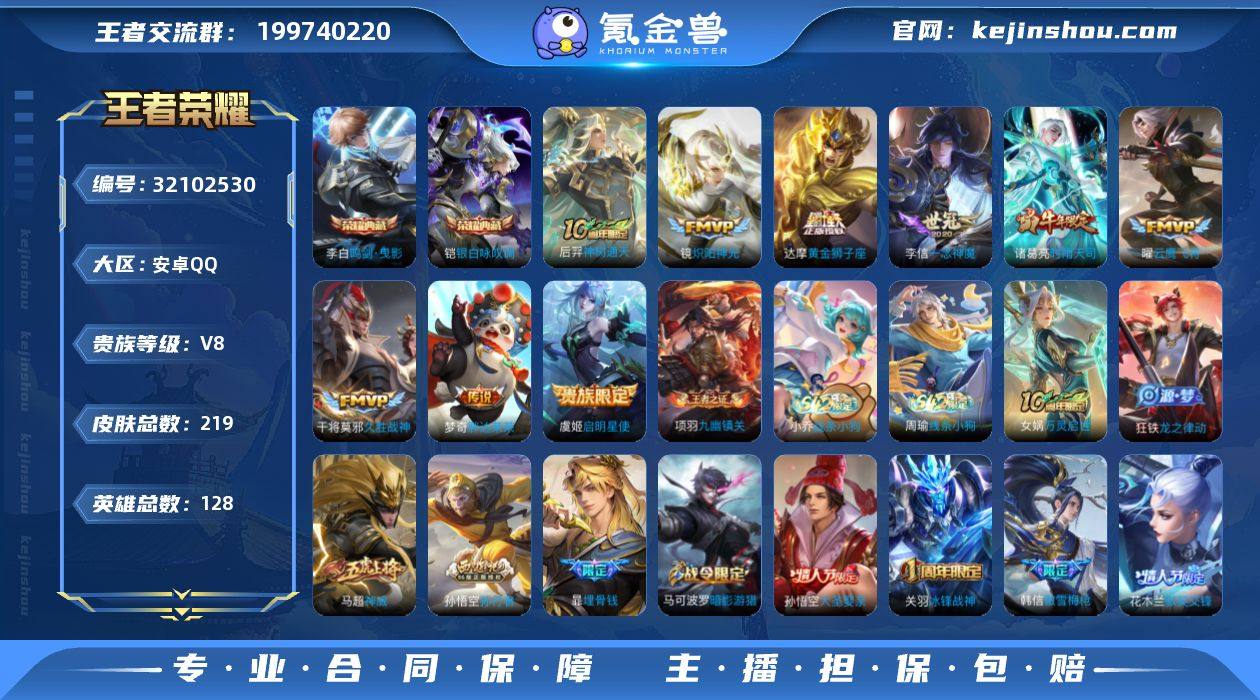 实名: 可修改 贵族等级: V8 英雄数: 128 皮肤数: 219 荣耀水晶: 鸣剑·曳影,银白咏叹调 传说皮: 黄金狮子座,云鹰飞将,久胜战神,炽阳神光,一念神魔,胖达荣荣,神树通天 限定皮: 冰锋战神,李小龙,梁祝,御风骁将,时雨天司,白鹤梁神女,神威,蜜橘之夏,青春决赛季,逐梦之影,天狼绘梦者,朱雀志,大圣娶亲,默契交锋-花木兰,高山流水,孙行者,傲雪梅枪,时之祈愿-云中君,五谷丰年