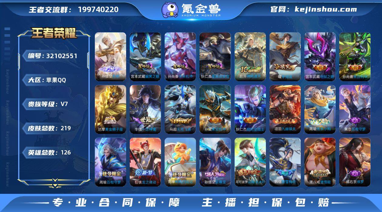 【WZ181099】苹果Q-V7-最强王者段位-126英雄-219皮肤-1无双-10传说-58史诗【无双皮肤】:孙悟空无相【传说皮肤】:云缨神骥越千峰,后羿神树通天,马超无双飞将,孙策末日机甲,曜李逍遥 ,李信一念神魔,达摩黄金狮子座,孙尚香末日机甲,宫本武藏地狱之眼,狄仁杰超时空战士【限定皮肤】:白起狰,狄仁杰阴阳师,虞姬凯尔特女王,赵云皇家上将,墨子神迹守卫,庄周高山流水,孙膑妖精王,扁鹊炼金王,白起夜都怪侠,芈月幻夜卜梦,元歌无心,曹操烛龙,典韦穷奇,马可波罗山海玄木吟,狄仁杰魔术师,达摩沙漠行僧,项羽海滩派对,老夫子航海奇遇记,韩信傲雪梅枪,兰陵王金庭之子,孙悟空至尊宝,后羿如梦令,李元芳云中旅人,钟馗驱傩正仪,雅典娜黎明之约,太乙真人饕餮,鬼谷子五谷丰年,黄忠火炮绅士,苏烈千军破阵,百里玄策原初追逐者,弈星混沌棋,梦奇顽趣,沈梦溪大漠名商,明世隐疑决卦,明世隐吟游魔法,裴擒虎擒涛扼浪,狂铁御狮,伽罗天狼溯光者,盾山御銮,猪八戒猪悟能,上官婉儿梁祝,嫦娥拒霜思,嫦娥暖冬兔眠,曜李逍遥 ,鲁班大师探海日志,桑启海盐诗旅,暃星界游侠,艾琳女武神,阿古朵江河有灵,张良古海寻踪,蒙恬荣光圣徽,鬼谷子天穹祈灯,沈梦溪龙舞盛年,刘邦剑破天穹,周瑜熔金海岸【年限皮肤】:马可波罗山海玄木吟【赛季限定】:孙膑妖精王,扁鹊炼金王,虞姬凯尔特女王,白起狰,太乙真人饕餮,曹操烛龙,典韦穷奇,狂铁御狮,盾山御銮,弈星混沌棋,明世隐疑决卦,钟馗驱傩正仪,苏烈千军破阵,达摩沙漠行僧,兰陵王金庭之子,沈梦溪大漠名商,李元芳云中旅人,桑启海盐诗旅,裴擒虎擒涛扼浪,鲁班大师探海日志,张良古海寻踪,鬼谷子天穹祈灯,刘邦剑破天穹,太乙真人谧流熔炉,钟馗虚灵犬护,甄姬逆浪荇歌,亚瑟荣光之誓,百里玄策原初追逐者,雅典娜黎明之约,梦奇顽趣,蒙...